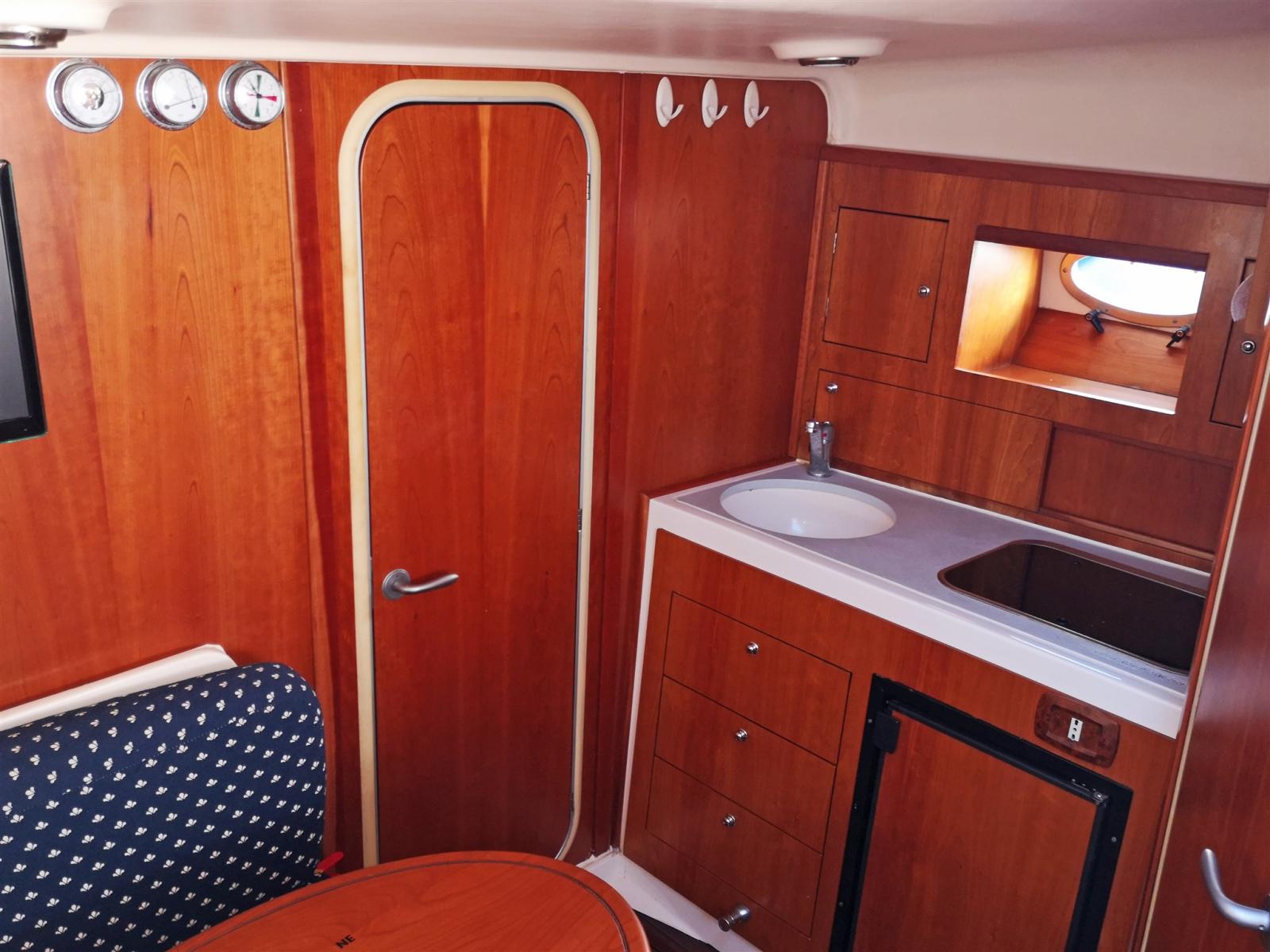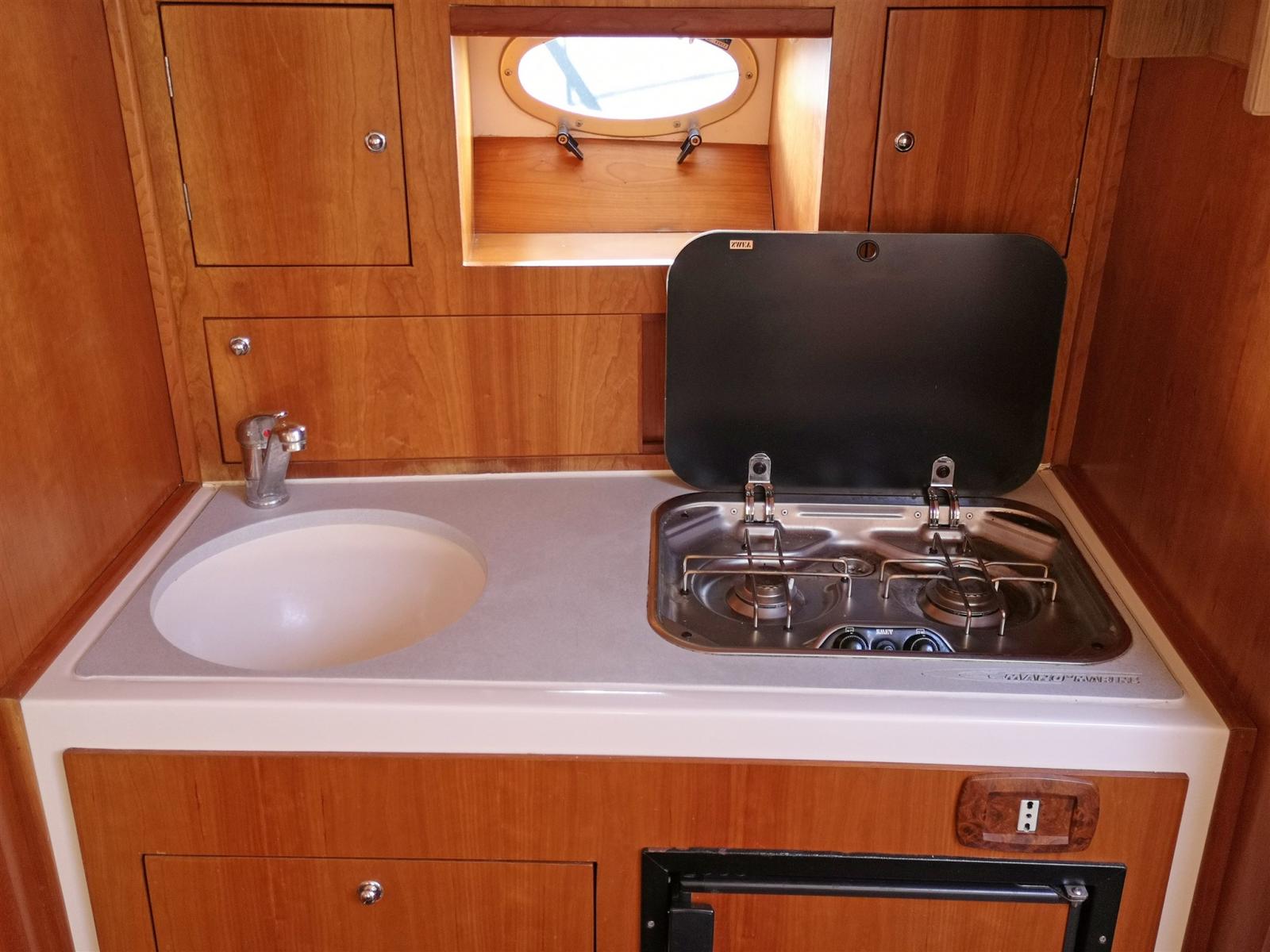 Cuisine de cockpit équipée avec évier, cuisinière à gaz et réfrigérateur