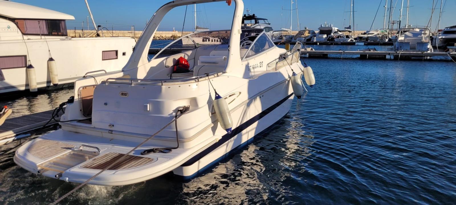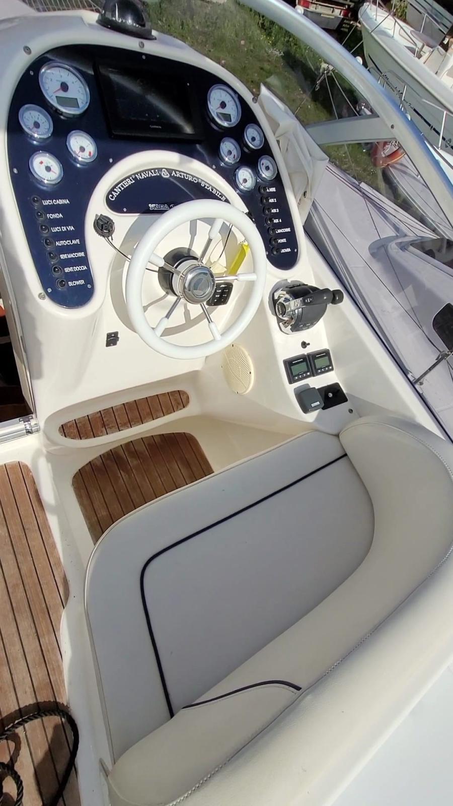 4 Batteries (2 motori + 2 servizi), Douche de cockpit, Phare de poursuite, 6 Défenses, Plateforme arrière (plancetta allungata), Pompe de cale manuelle, Guindeau électrique, Echelle de bain, table de cockpit.
