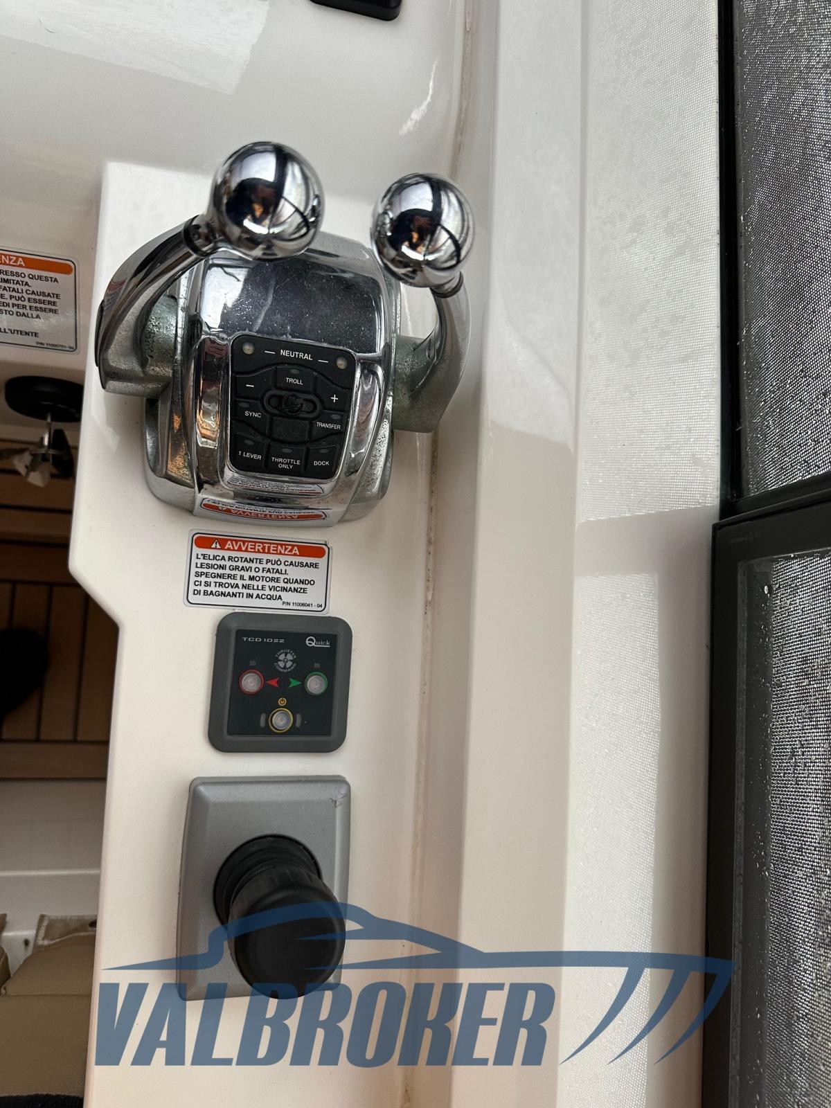 Indicateur d'angle de barre, Ordinateur fixe de bord (Smartcraft + Mercruiser), Compteur de chaîne (2019), Joystick (manovra), Plotter GPS (Raymarine E120), Radar (Raymarine 2019).