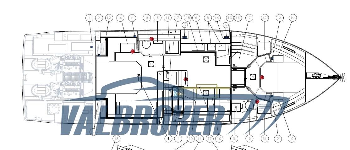pare-brise et couvercle de hayon en PVC blanc ; selles pliantes pour annexes ; fosse septique avec broyeur électrique, drain de pont et vanne à trois voies ; canapé de salon en cuir ; Têtes de lit en cuir chocolat avec coutures brunes ; meubles en bois de chêne ; mobilier upgrades salons et cabines recouverts de cuir, Skyhook incluant fonction de suivi des waypoints pour maintenir le bateau à l’arrêt lors d’un arrêt (station-service etc.), canapé intérieur