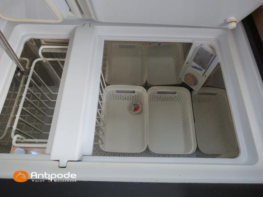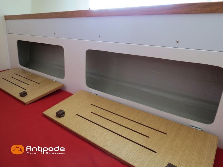 Nous souhaitions une version avec 3 cabines pour nous permettre d'accueillir des équipiers. Il reste tout à fait possible de dédier une des deux cabines arrière à une soute technique, mais nous n'avons pas eu à le faire. Les coffres de cockpit sont en effet très vastes, et on y loge absolument tout : annexe, béquille arrière, tuyaux, câble électrique, jerrican, pare-battages, voiles d'avant (deux spis et une trinquette), mouillage secondaire, aussières, etc etc. Et il reste encore beaucoup de place pour d'autres équipements.