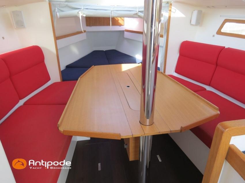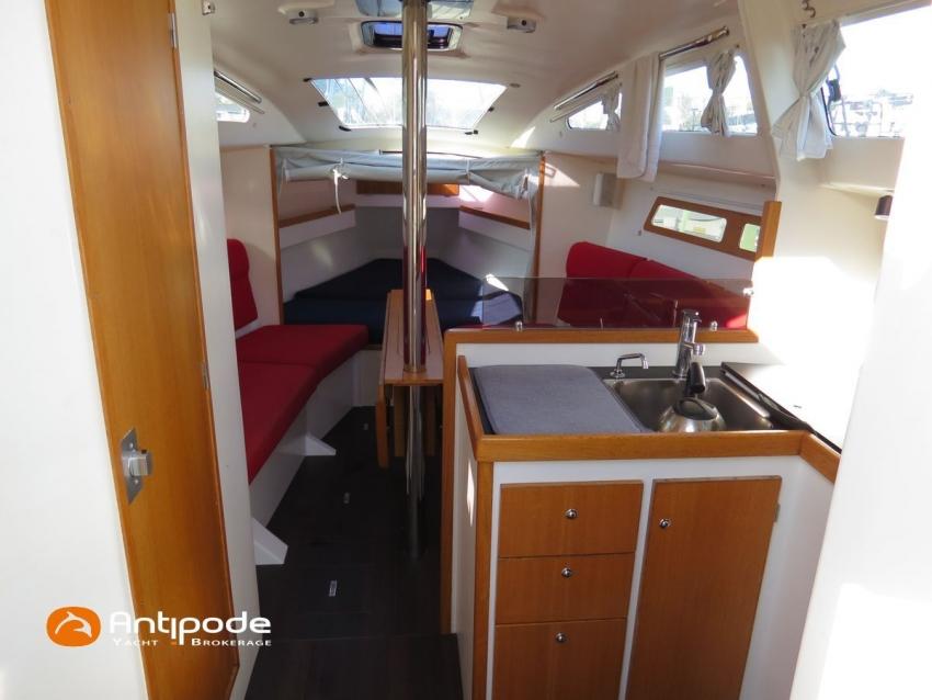 L'aménagement est sobre mais très bien conçu, pratique en mer et confortable à l'escale : cuisine très bien agencée, beaucoup de coffres intérieurs vastes et accessibles, hauteur sous barreau (plus de 1,90m) très élevée pour un 32/33 pieds, et qui reste élevée quand on va vers l'avant.