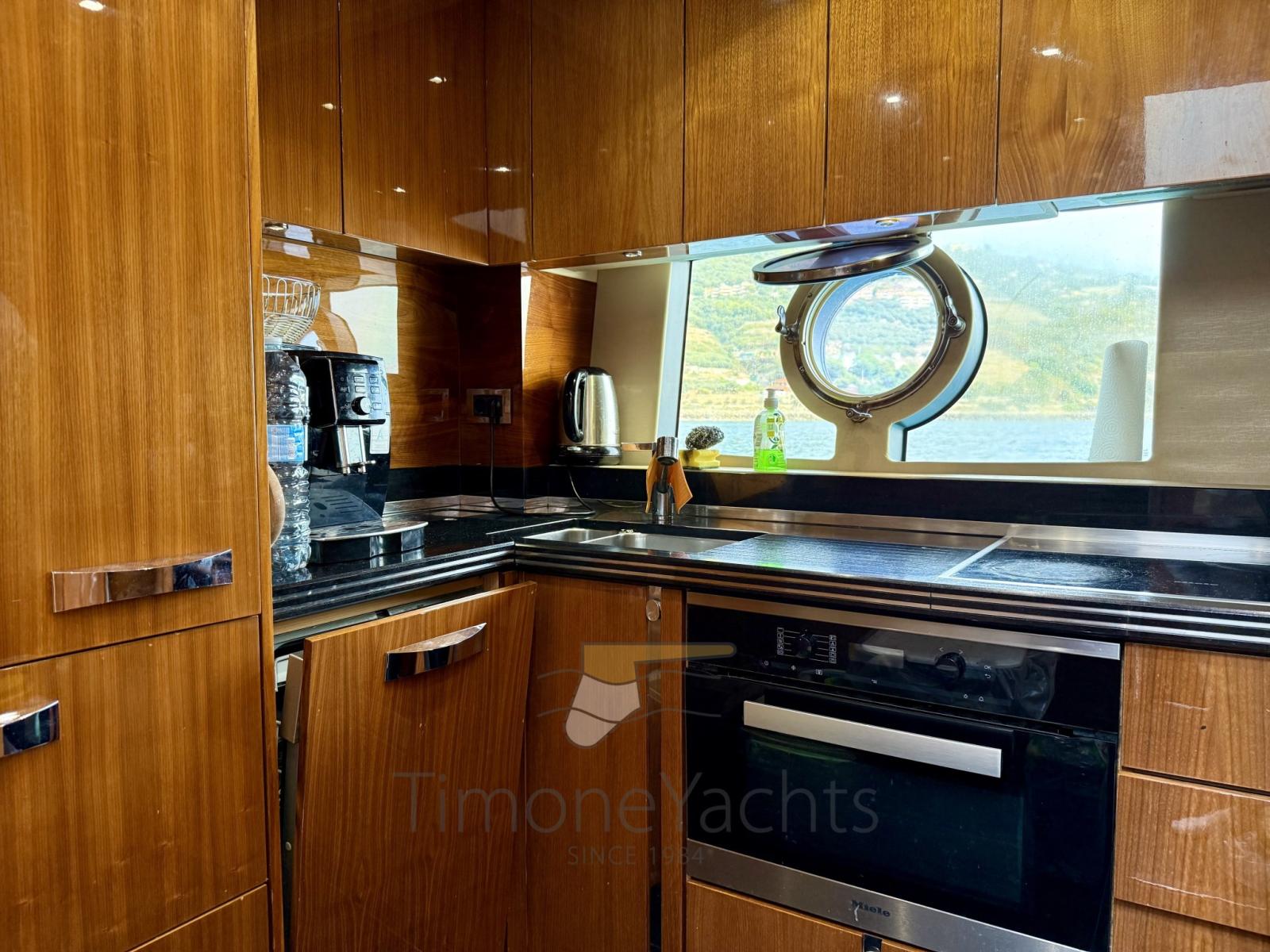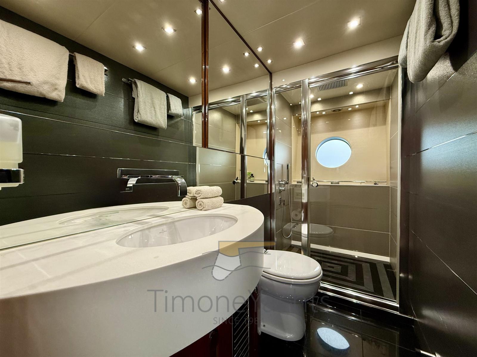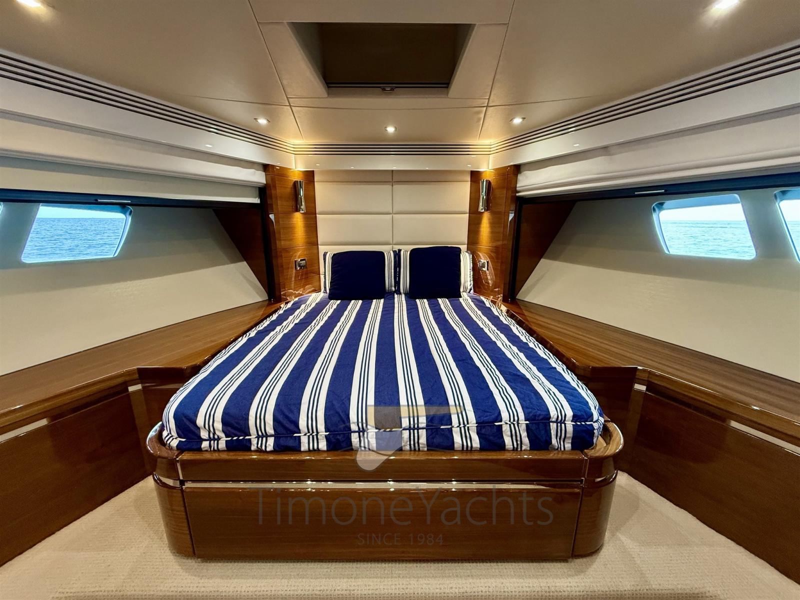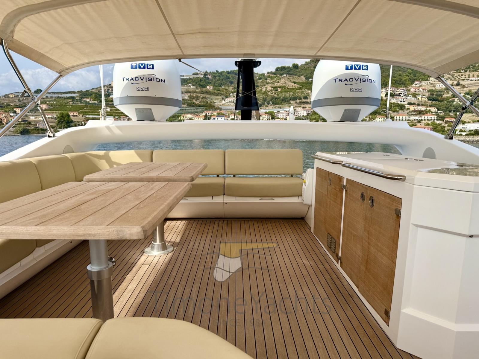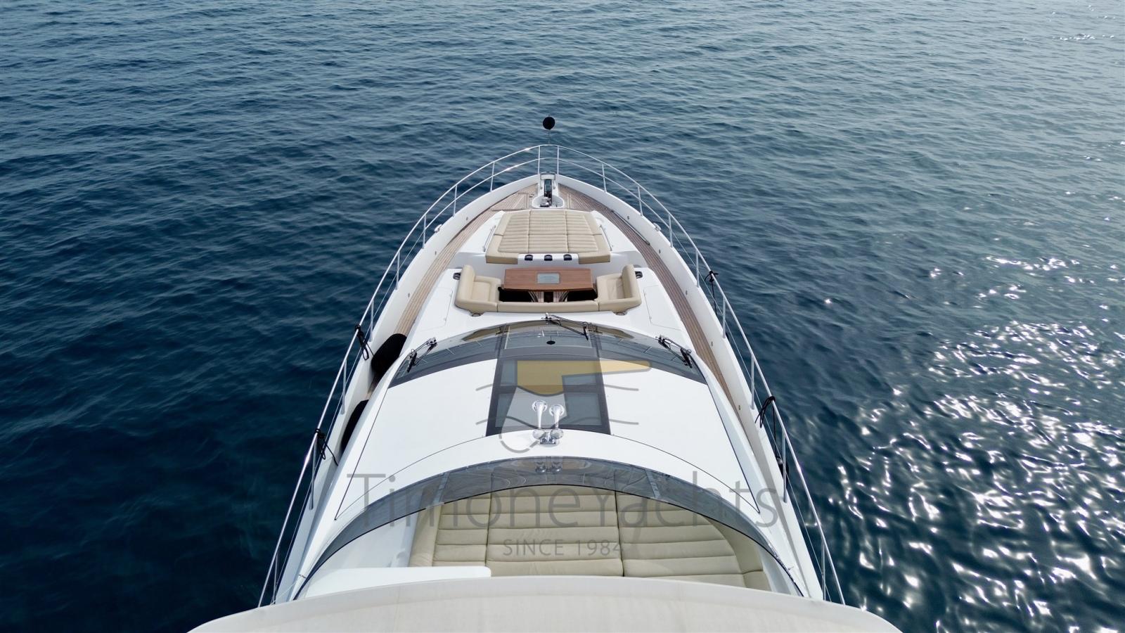 La ligne élégante et agressive est unique, les espaces extérieurs sont grands et très bien agencés. La sensation que l’on ressent en étant dans le cockpit arrière, à la volée ou sur le pont avant est très confortable. Les logements sont également confortables, avec 4 grandes cabines d’invités, chacune avec une salle de bain privée + équipage. Garage à annexe et plate-forme arrière.
