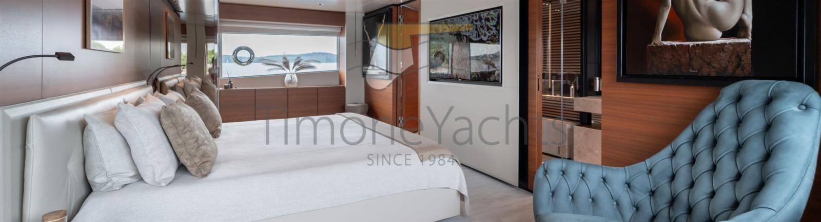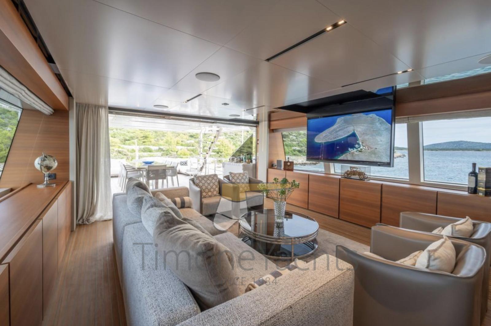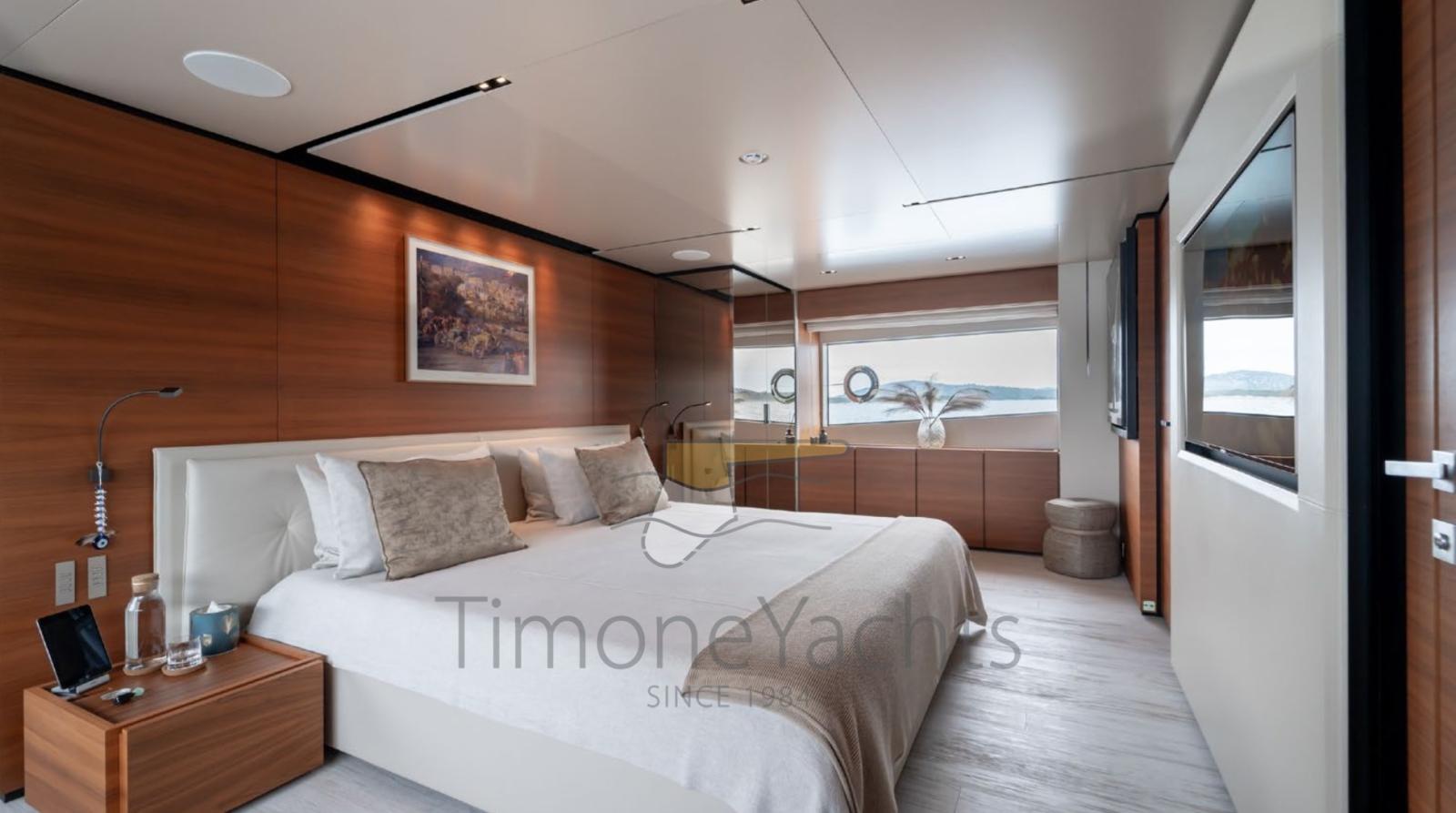 Le yacht offre des espaces fabuleux aux propriétaires et à leurs invités sur les quatre ponts par la suite principale à large corps avant sur le pont principal jusqu’aux quatre cabines invités, toutes avec tête en suite sur le pont inférieur. Grâce à la terrasse panoramique extérieure et aux magnifiques fenêtres et portes qui s’ouvrent, aux salons et aux salles à manger intérieures et extérieures, tout est très spacieux et lumineux.