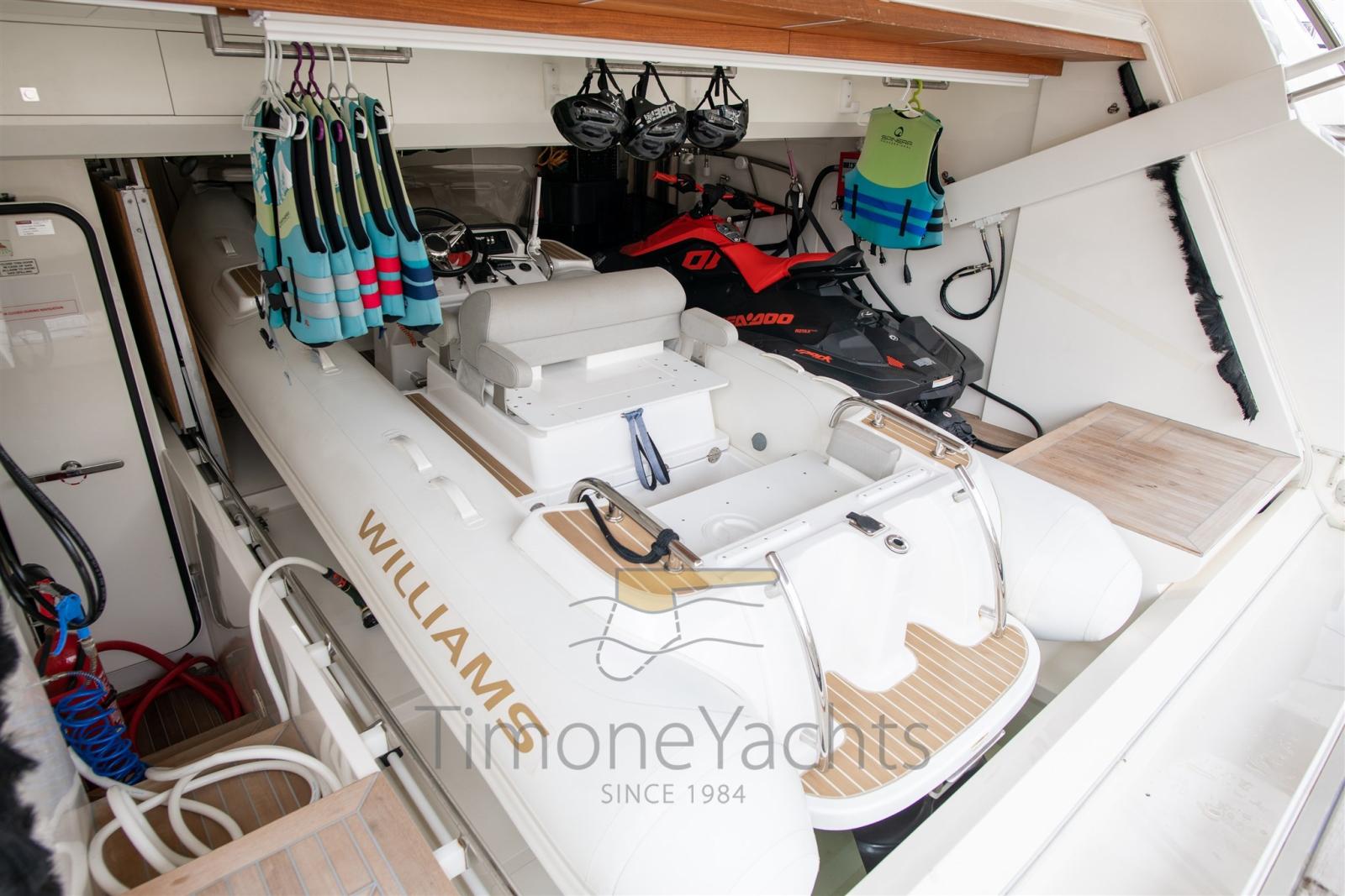 Taquets pliants, Passavant en teck, Phare de poursuite, Garage à annexe, Hard top, Extincteur(s) fixe(s), Lavage de chaine, Lavabo dans le cockpit, Spots sous-marins, Jet-ski, Passerelle, Porte latérale, Cockpit en teck, Prise de quai, Connexion eau sous pression à quai, Stabilisateurs (nr 2 Seakeeper + ABI Trac fins), table de cockpit, Annexe, Corne, 2 Winch électrique arrière, 2 Winch électrique avant.