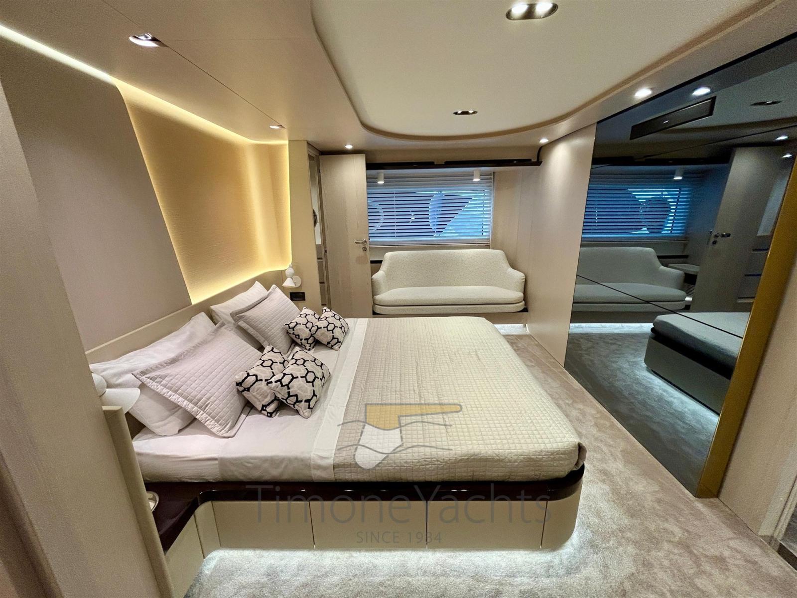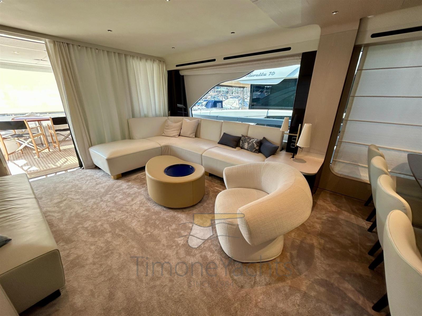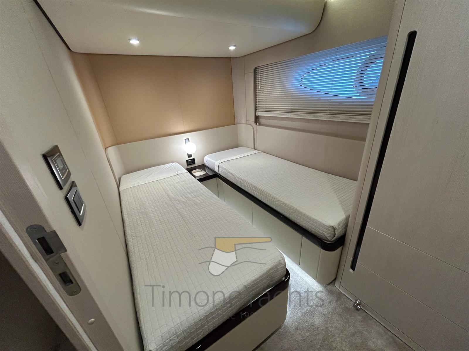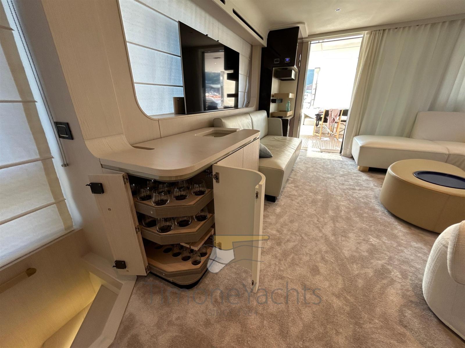 Alarme gaz, Alarme moteur, Alarme de pompe de cale, Alternateur, Eau sous pression, Passavant en teck, Douche de cockpit, Double barre à roue, Flaps électriques, Hard top, Lavage de chaine, Lavabo dans le cockpit, Spots sous-marins, Passerelle, Plateforme arrière, Pompe de cale automatique, Pont en teck, Porte latérale, Porte latérale, Cockpit en teck, Prise de quai, Connexion eau sous pression à quai, Echelle de bain, Stabilisateurs (Seakeeper NG 26), table de cockpit, Annexe, Corne.
