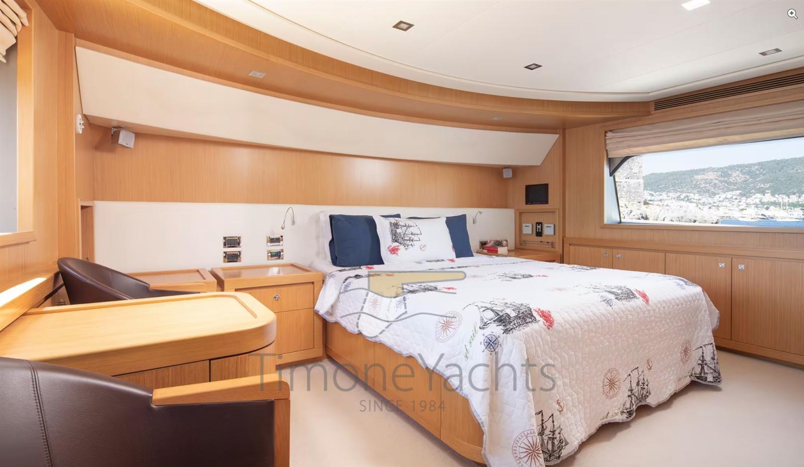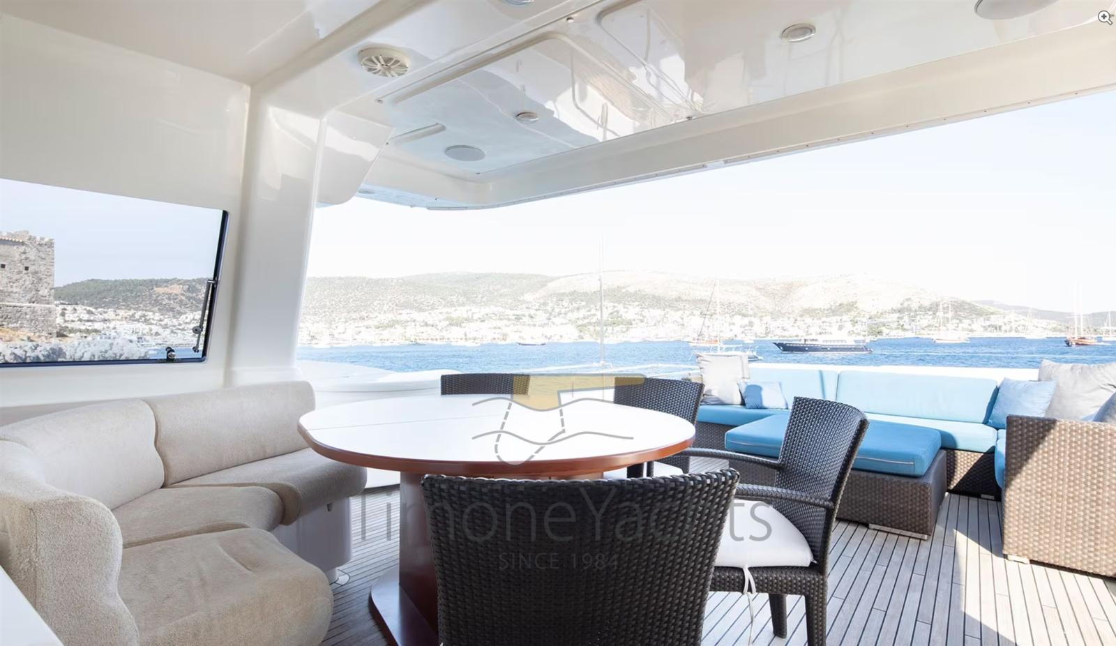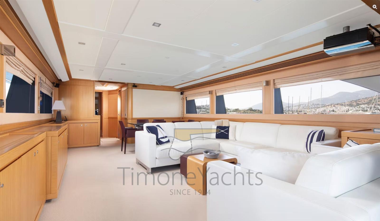 Alternateur, Eau sous pression, Passavant en teck, Douche de cockpit, Double barre à roue, Phare de poursuite, Garage à annexe, Grue de flybridge, Hard top, Extincteur(s) fixe(s), Lavage de chaine, Lavabo dans le cockpit, Éclairage de courtoisie, Passerelle, Pont en teck, Porte latérale, 4 Porte latérale, Cockpit en teck, Prise de quai, Connexion eau sous pression à quai, Selles pour Annexe, Stabilisateurs (Zero Speed Stabilizers), table de cockpit, Annexe (4.3m Capelli tender with 70hp Yamaha engine), Corne, 2 Winch électrique arrière, Winch électrique avant.