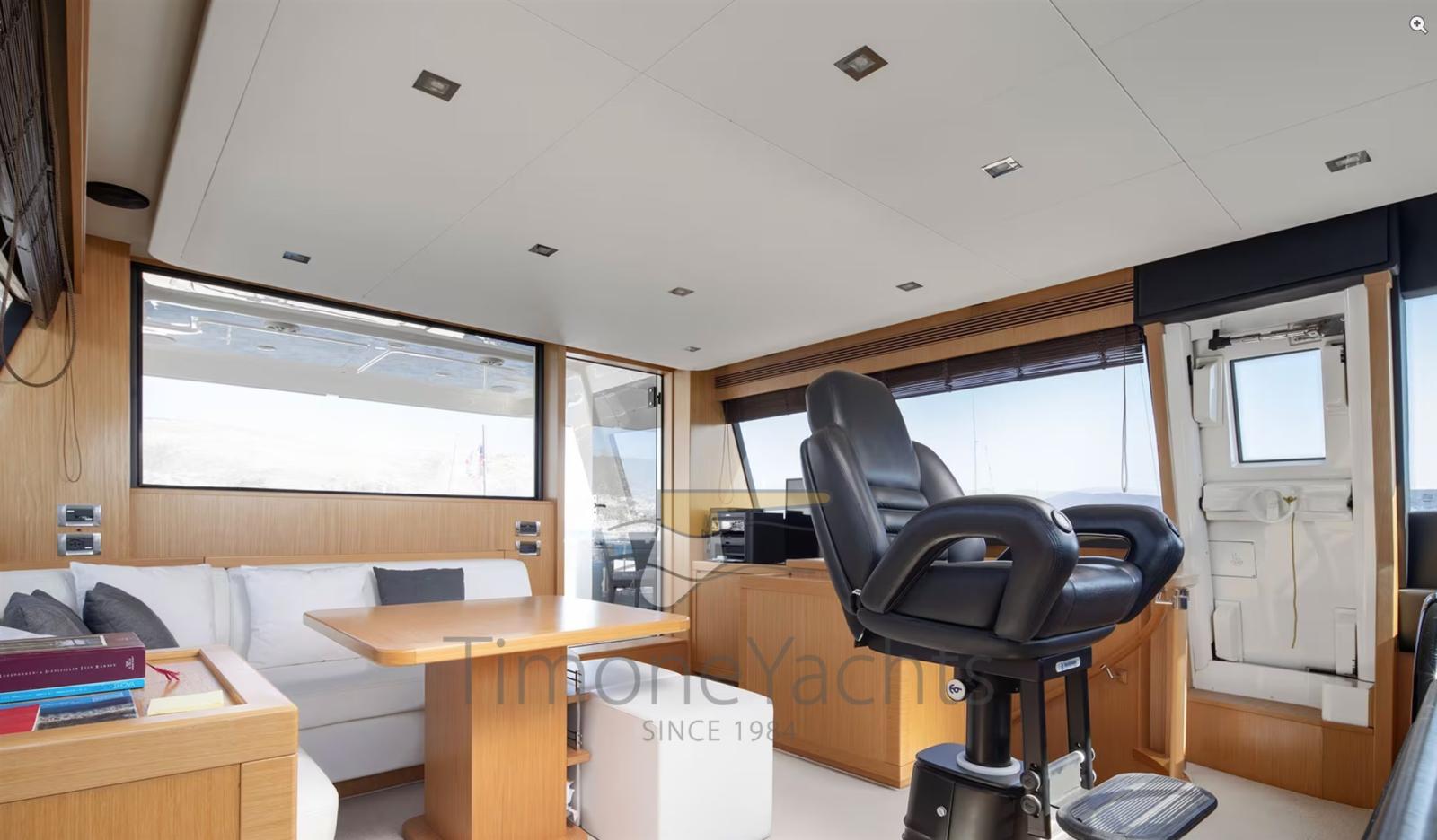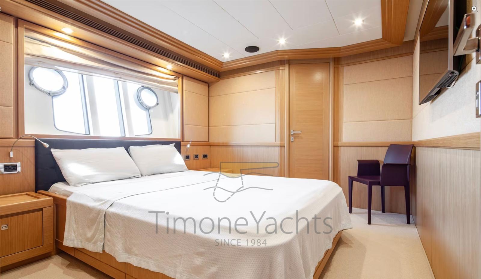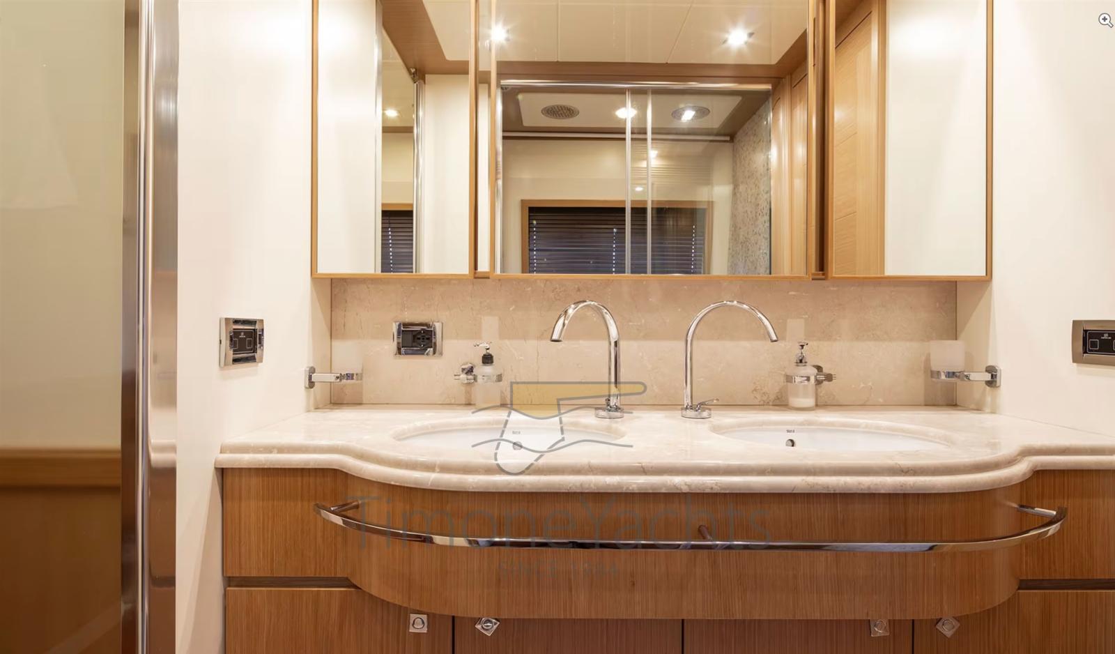 Alternateur, Eau sous pression, Passavant en teck, Douche de cockpit, Double barre à roue, Phare de poursuite, Garage à annexe, Grue de flybridge, Hard top, Extincteur(s) fixe(s), Lavage de chaine, Lavabo dans le cockpit, Éclairage de courtoisie, Passerelle, Pont en teck, Porte latérale, 4 Porte latérale, Cockpit en teck, Prise de quai, Connexion eau sous pression à quai, Selles pour Annexe, Stabilisateurs (Zero Speed Stabilizers), table de cockpit, Annexe (4.3m Capelli tender with 70hp Yamaha engine), Corne, 2 Winch électrique arrière, Winch électrique avant.