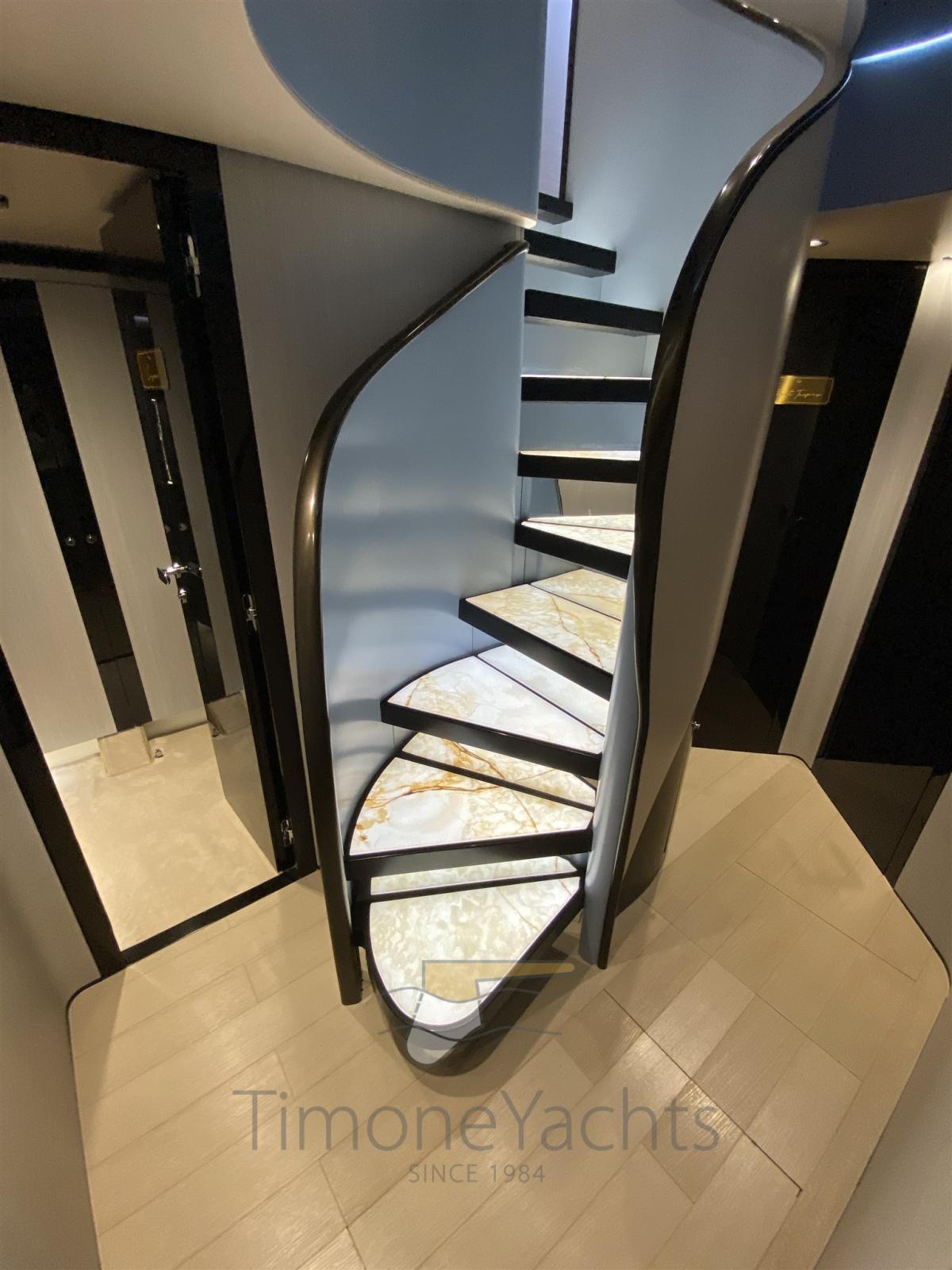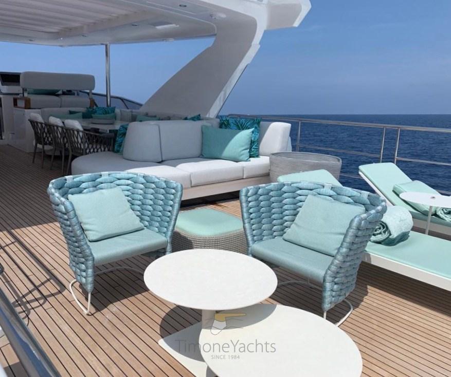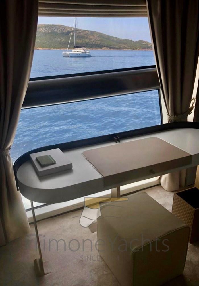 Trim hydraulique (Humphree), Passavant en teck, Douche de cockpit, Phare de poursuite, Flaps électriques, Garage à annexe, Hard top, Extincteur(s) fixe(s), Indicateurs de flaps, Lavage de chaine, Spots sous-marins, Passerelle, Porte latérale, Cockpit en teck, Prise de quai, Connexion eau sous pression à quai, Stabilisateurs (CMC fins (underway + zero speed)), table de cockpit, Annexe (Williams 445), Corne, 2 Winch électrique arrière, 2 Winch électrique avant.