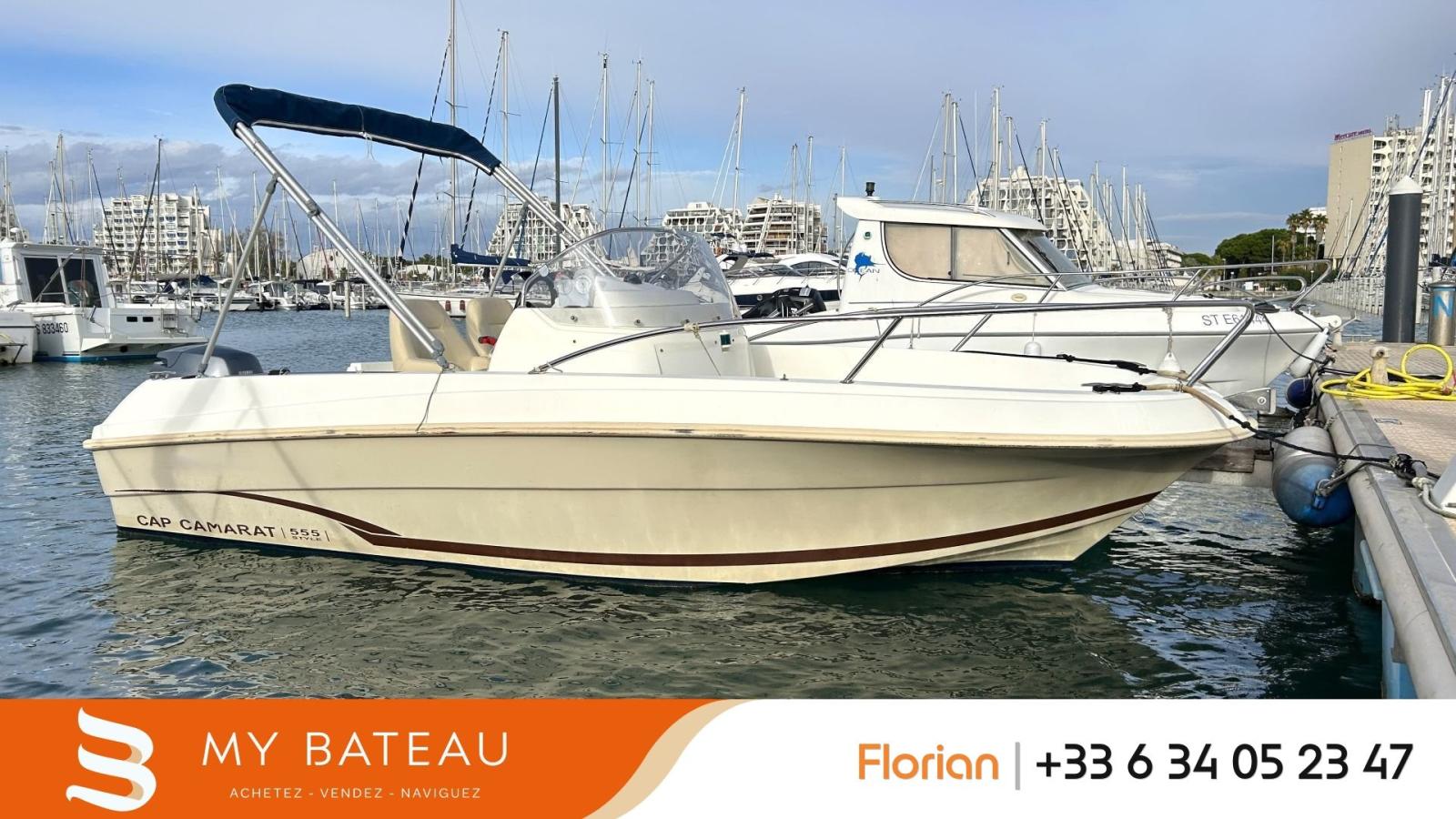 Exclusivité MY BATEAU, CAP CAMARAT 555 Style, 1 ère main de 2010, motorisé en 100cv YAMAHA (420h) toujours entretenu par le concessionnaire, dossier facture d'entretien complet, GPS, Sondeur et Taud de soleil. VENDU avec sa PLACE DE PORT sur La Grande Motte... REPRISE ET FINANCEMENT possible, contactez Florian au 06 34 05 23 47