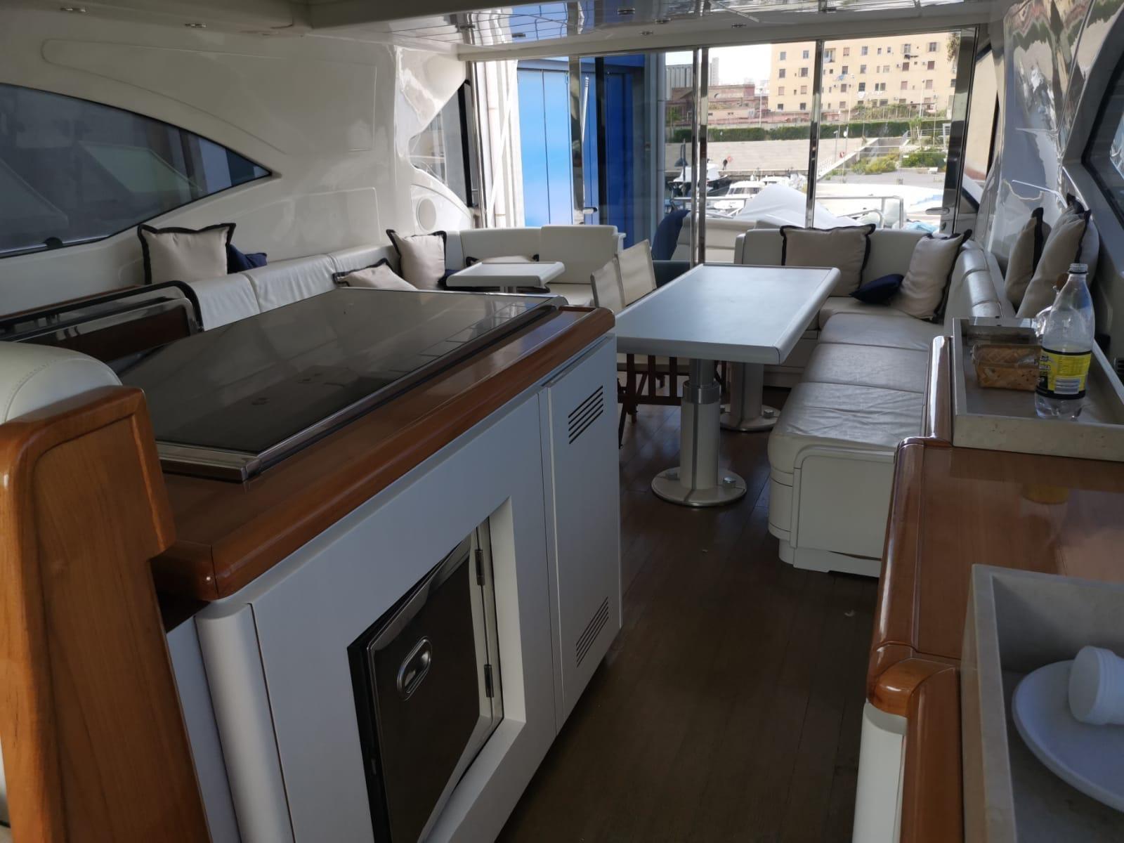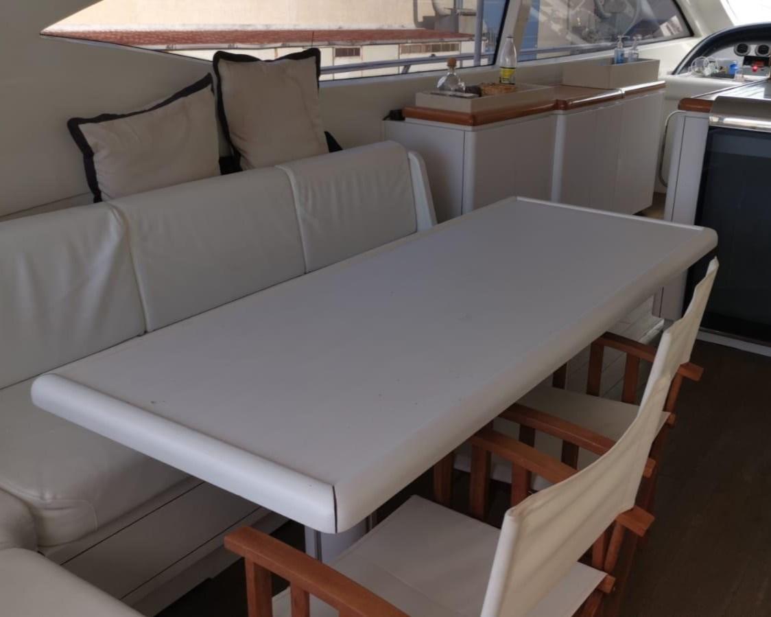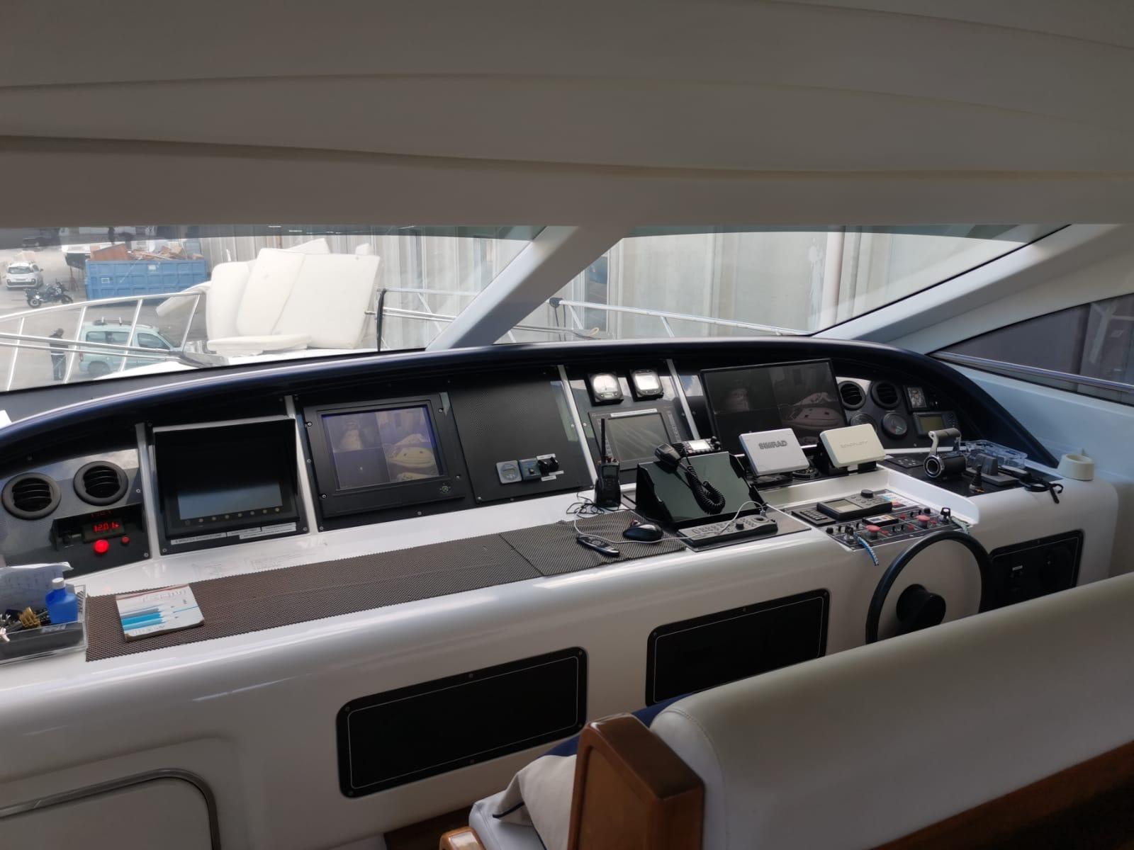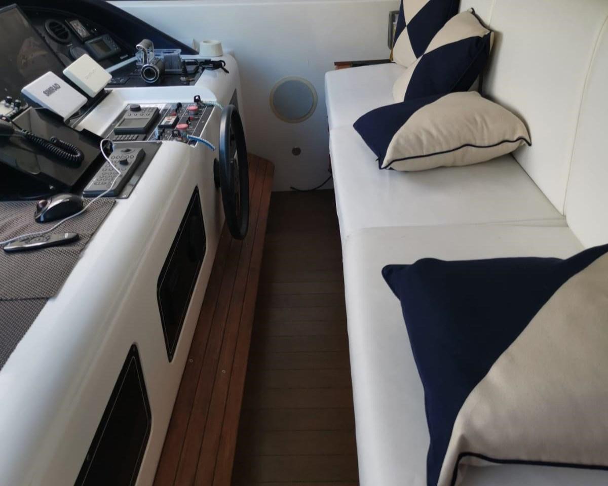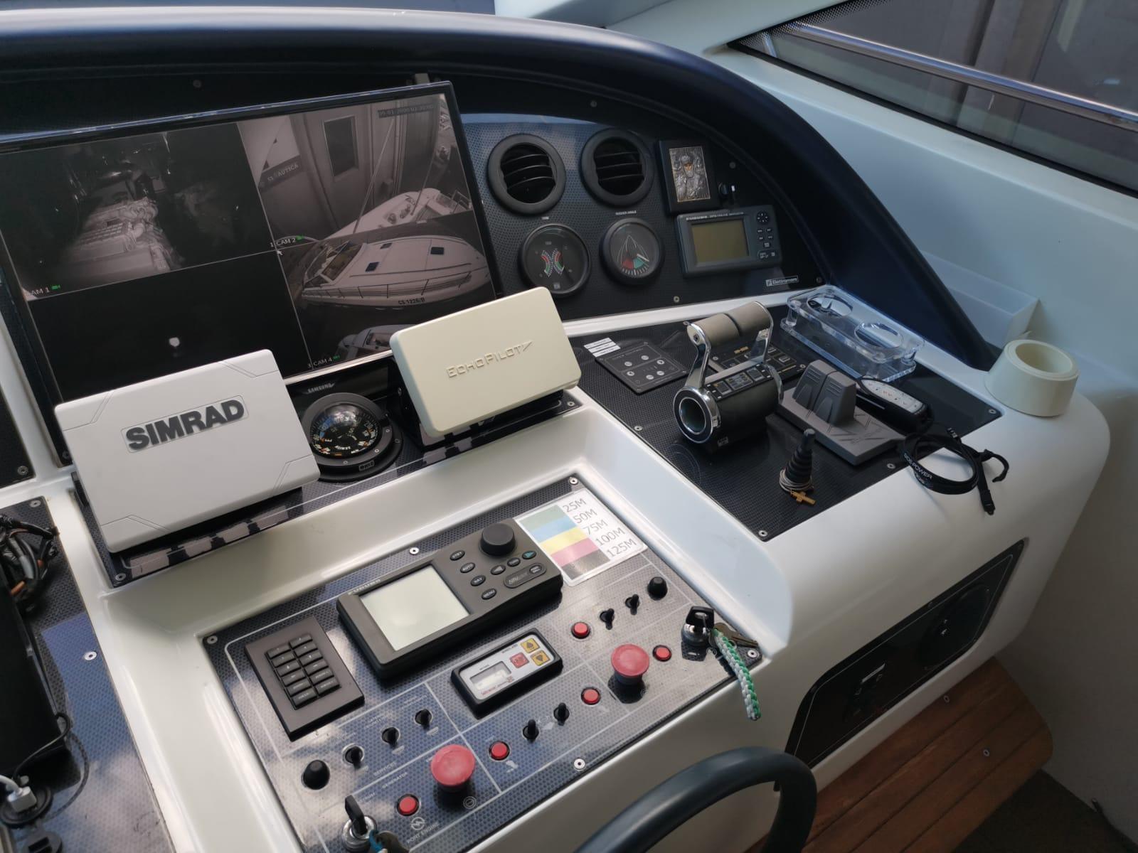 Alarme moteur, Alarme de pompe de cale, Alternateur, Eau sous pression (agosto 2024), Batteries (Litio agosto 2024), Douche de cockpit, Phare de poursuite, Flaps hydrauliques, Garage à annexe, Bossoirs pour annexe, Hard top, Extincteur(s) fixe(s), Indicateurs de flaps, Lavage de chaine, Lavabo dans le cockpit, Éclairage de courtoisie, Spots sous-marins, Passerelle, Plateforme arrière, Pompe de cale automatique, Pompe de cale manuelle, Porte latérale, Cockpit en teck, Prise de quai, Connexion eau sous pression à quai, Onduleur, Guindeau électrique, Echelle de bain, table de cockpit, Corne, Winch électrique arrière, Winch électrique avant.