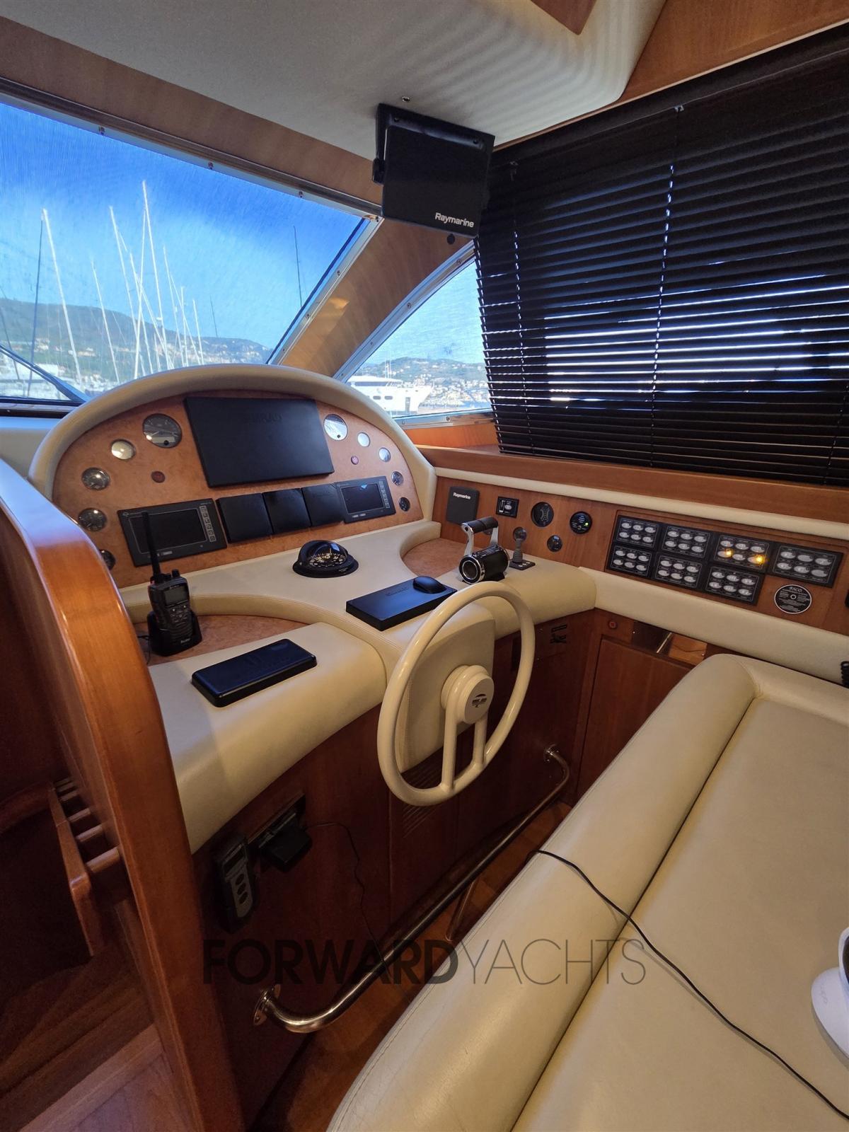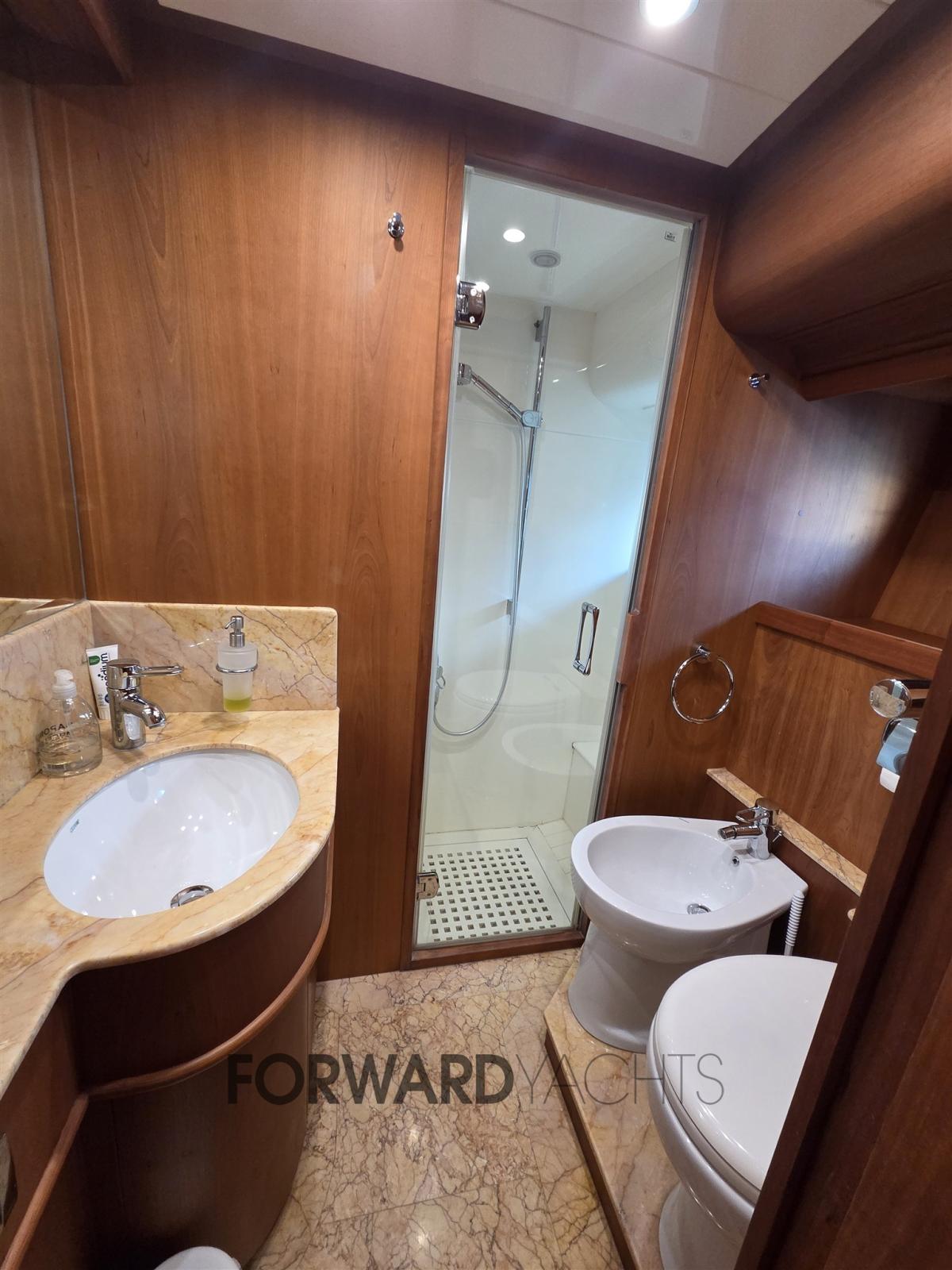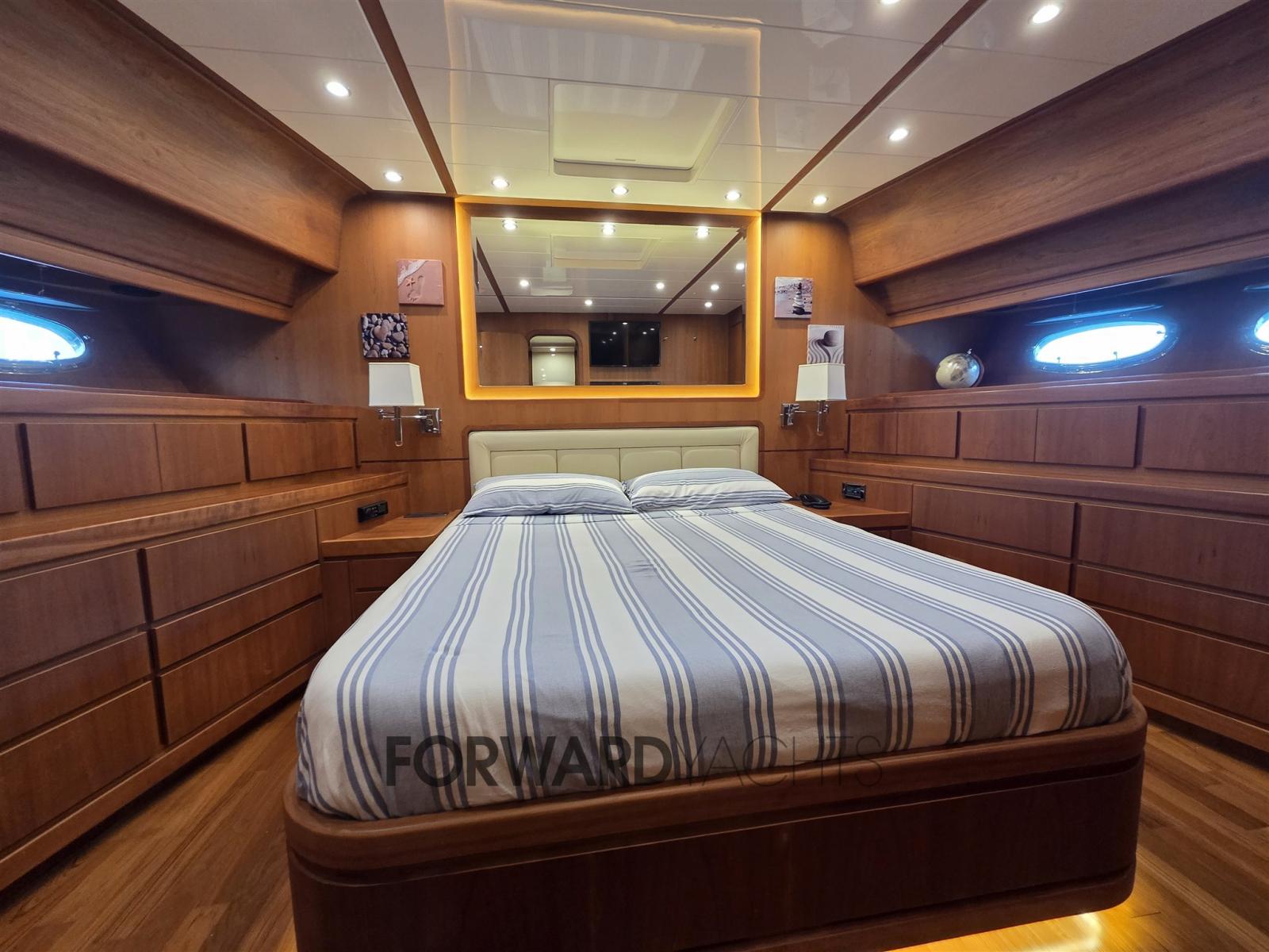 Nombreux accessoires dont : propulseur d’étrave en teck, pont et flybridge, passerelle hydraulique, 2 groupes électrogènes, machine à glaçons, réfrigérateurs, dessalinisateur, pont arrière en teck, climatisation.