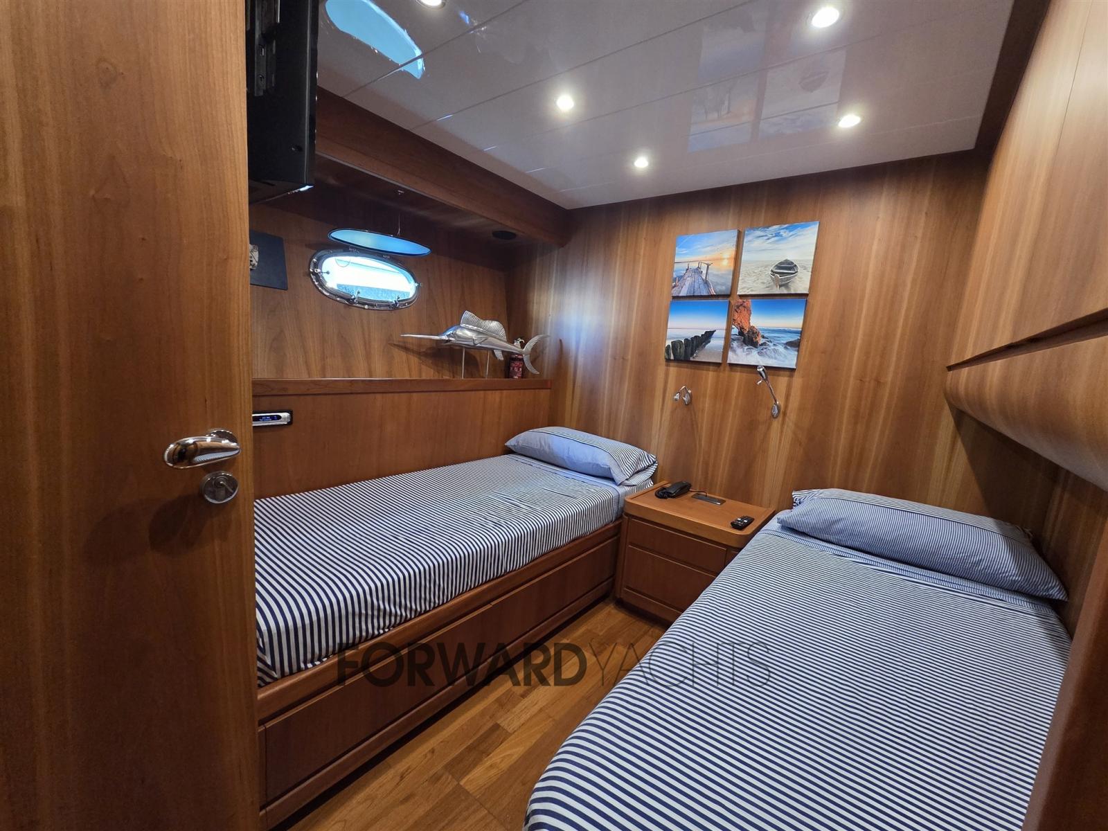 Beau bateau avec coin couchage composé de 4 cabines avec salle de bain et espace équipage séparé à l’avant.