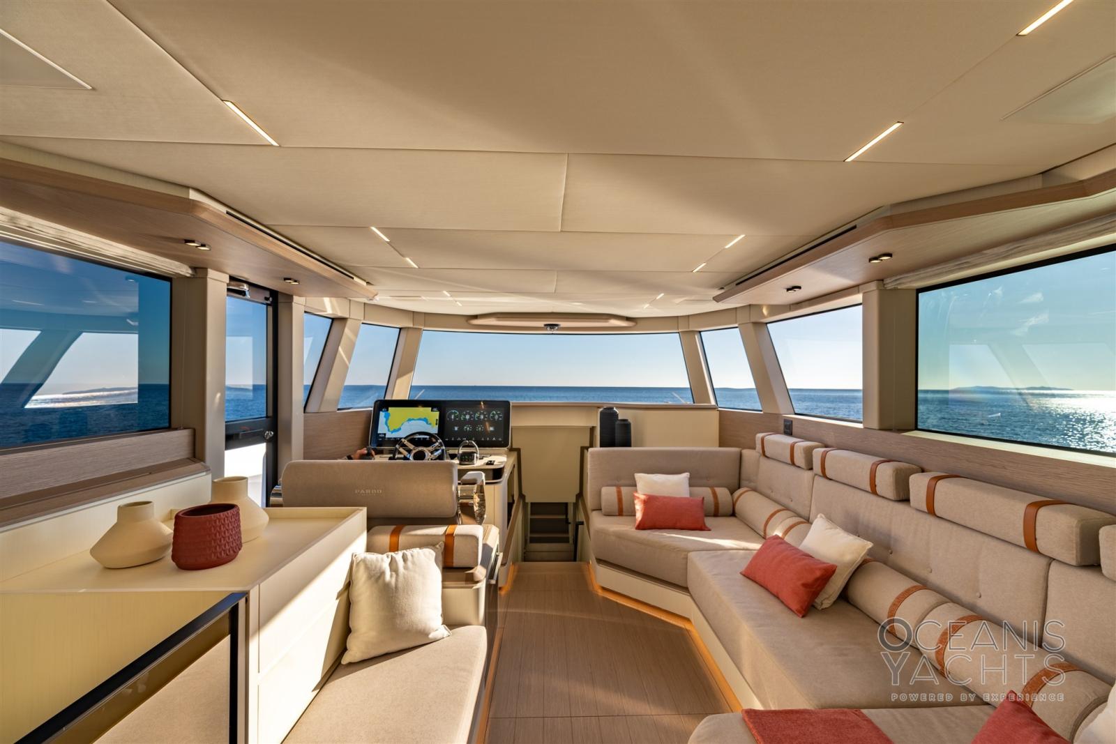 Bimini (elettrico in pozzetto), Sellerie complète, Coussins arrieres, Coussin avant, Sellerie de fly, sellerie de cockpit, Matelas, Taud de soleil, Rideaux (elettriche per tutti gli ambienti).