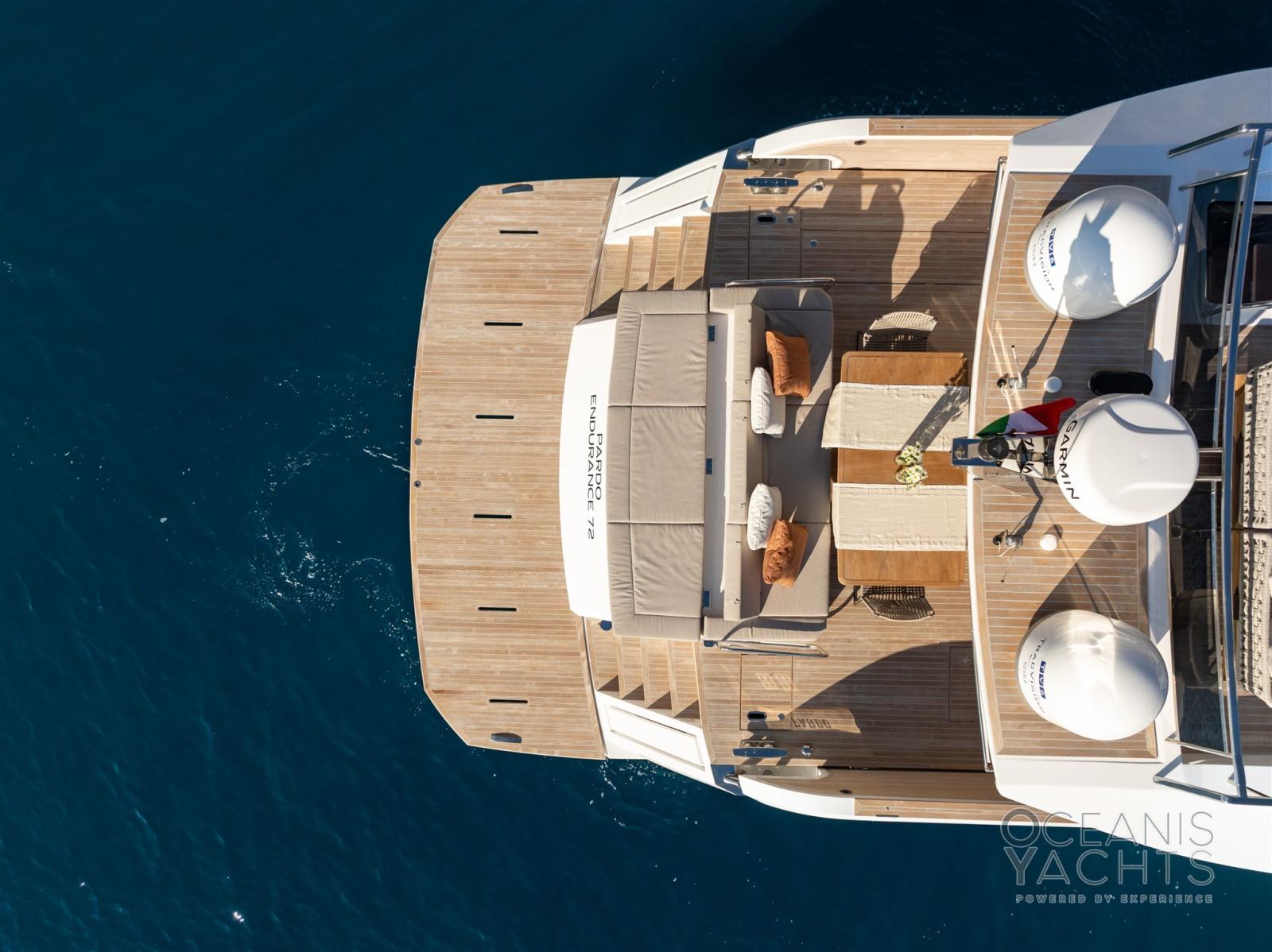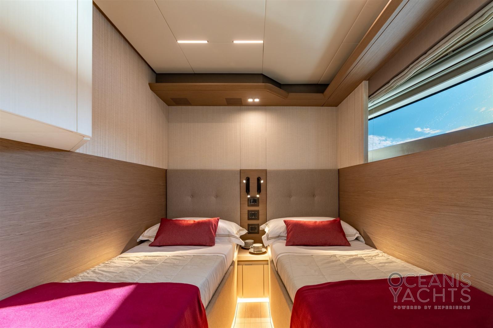 Alarme gaz, Alarme moteur, Alarme de pompe de cale, Alternateur, Auto Dynamic Trim Interceptor, Eau sous pression, Passavant en teck, Câble d’alimentation à quai, Douche de cockpit, Double barre à roue, Phare de poursuite, Garage à annexe, Extincteur(s) fixe(s), Éclairage de courtoisie, Spots sous-marins, Passerelle (idraulica a scomparsa), Plateforme arrière (idraulica di poppa), Pompe de cale automatique, Pompe de cale manuelle, Pont en teck, Porte latérale, Porte latérale, Cockpit en teck, Prise de quai (con avvolgitore elettrico Glendinning), Connexion eau sous pression à quai, Guindeau électrique, Echelle de bain, Selles pour Annexe, Stabilisateurs, table de cockpit, Corne, Pont en teck, Winch, Winch électrique arrière, Winch électrique avant.