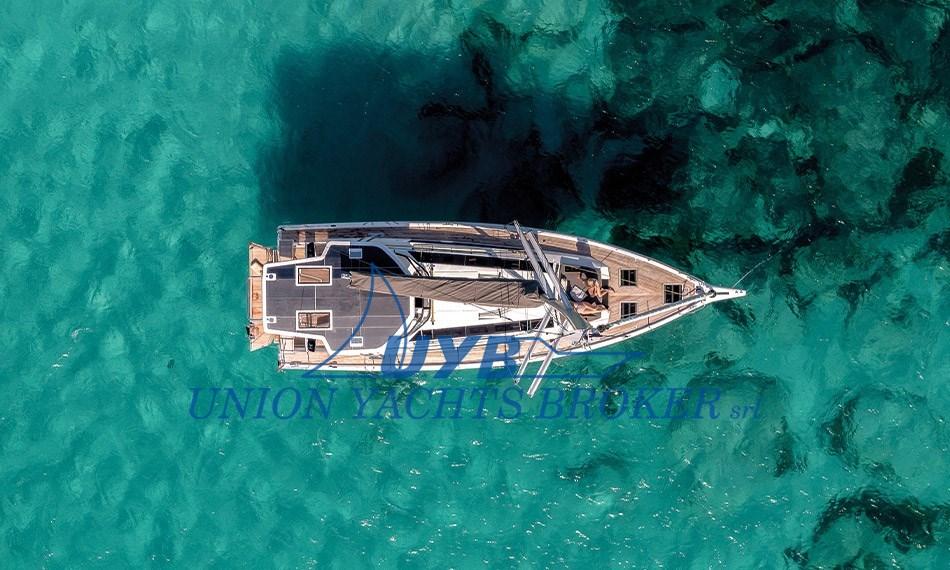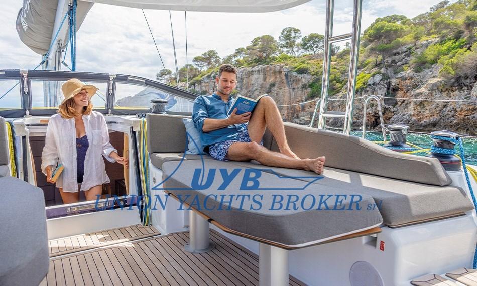 Ancre (Delta 25kg), Eau sous pression, 2 Batteries (Upgrade Agm 280ah), Douche de cockpit, 2 Double barre à roue (Ruote timone su consolle), Bossoirs, Lavabo dans le cockpit (Su piano in corian con cucina esterna a gas), 6 Défenses (6 parabordi), Plateforme arrière (Piattaforma elettrica), Pompe de cale automatique, Pompe de cale manuelle, Porte latérale, Prise de quai, Onduleur, Guindeau électrique, Gréement monotoron, Echelle de bain, Chaise support HB, table de cockpit, Filières avec sortie latèrale, 6 Winch électrique (Winch tuga mastre pozzetto elettrici), Windex.