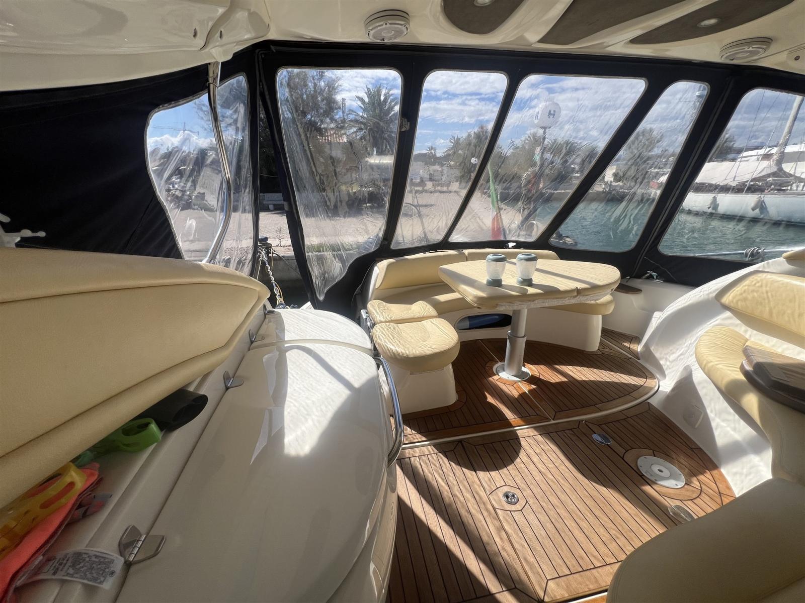 Alarme moteur, Alarme de pompe de cale, Alternateur, Ouverture du compartiment moteur électrique, Eau sous pression, Trim hydraulique, Câble d’alimentation à quai, Couleur spéciale, Filères, Douche de cockpit, Phare de poursuite, Fixation de l’ancre, Flaps électriques, Hard top, Extincteur(s) fixe(s), Lavabo dans le cockpit, Éclairage de courtoisie, Spots sous-marins, Panneau solaire, Défenses, Plateforme arrière, Pompe de cale automatique, Cockpit en teck, Prise de quai, Guindeau électrique, Echelle de bain, table de cockpit, Corne, Winch électrique arrière.