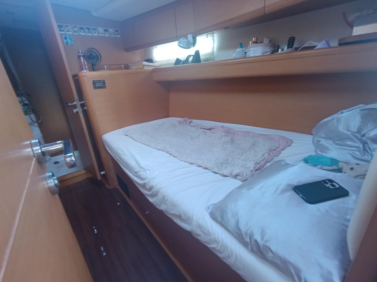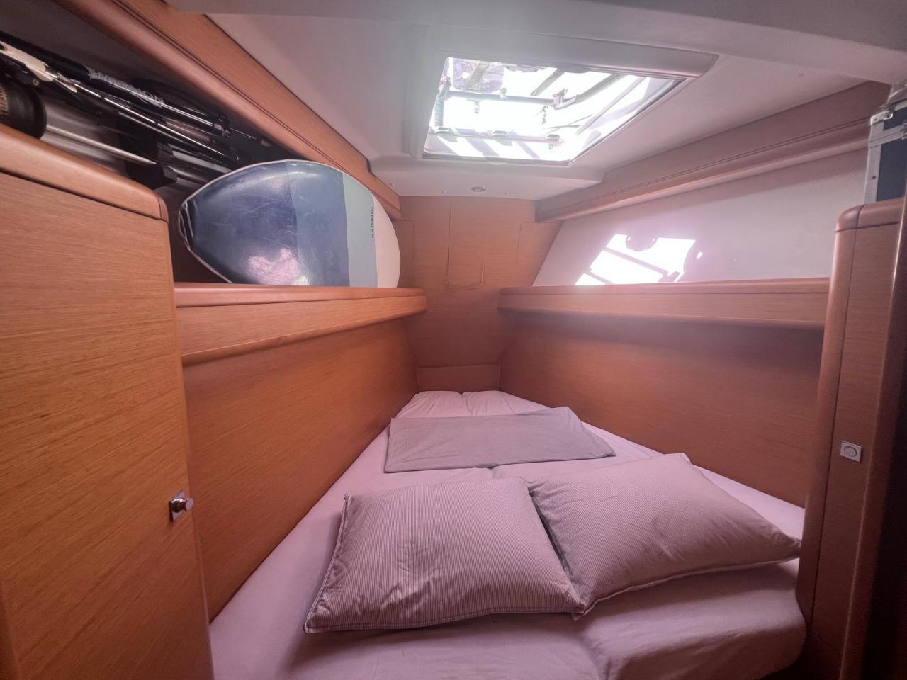 Une cabine skipper avec deux lits superposés à l'avant bâbord