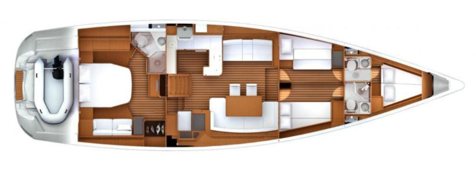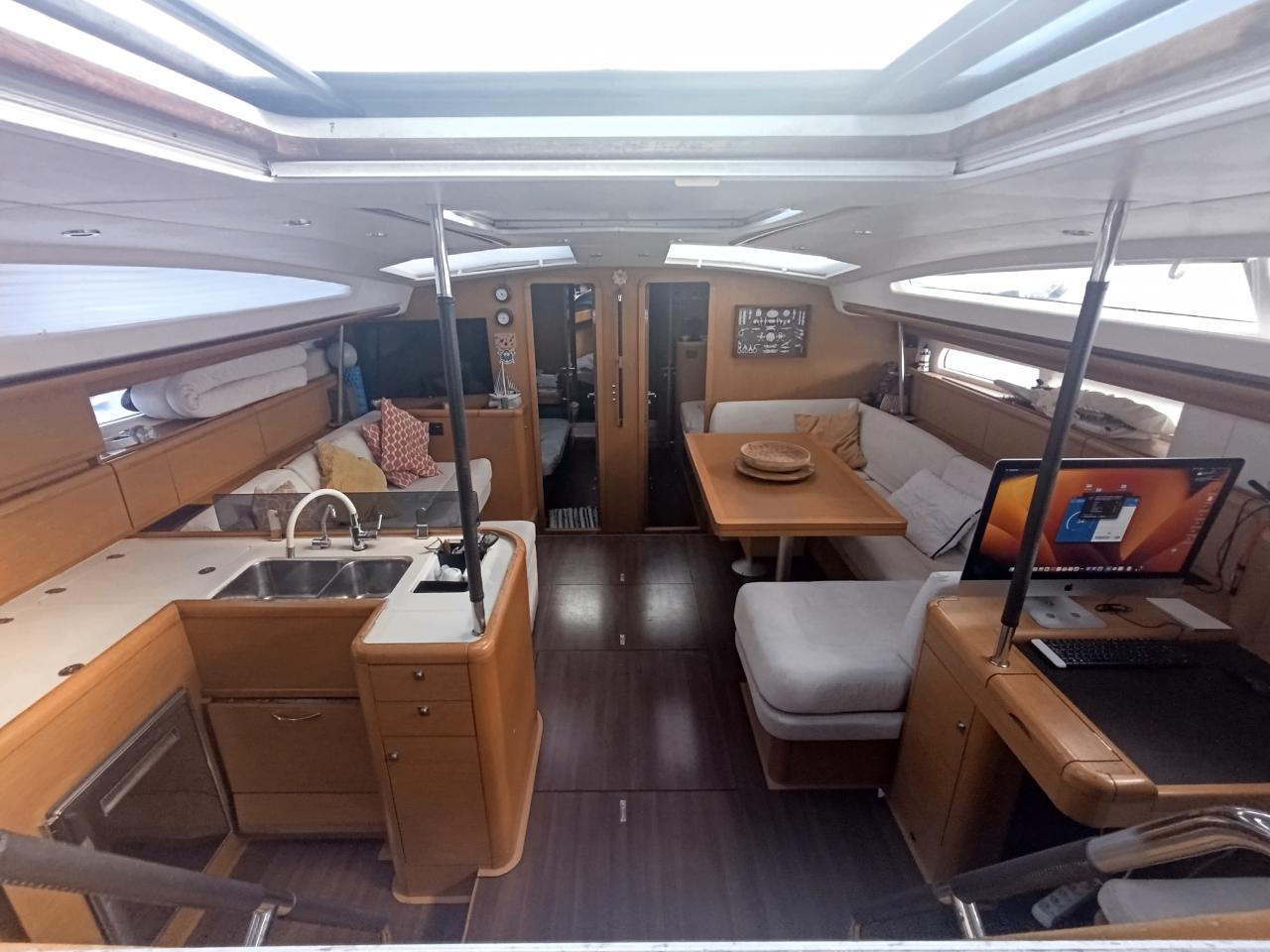Le Jeanneau 57 est un voilier de croisière haut de gamme construit par Jeanneau en France. Conçu par l’architecte naval Philippe Briand, construit en 2010, troisième propriétaire, nombreux équipements de 2025, version trois cabines invités, et une quatrième cabine skipper à l’avant.