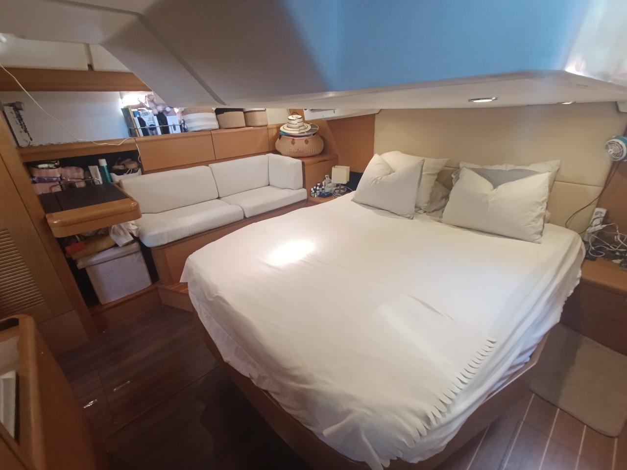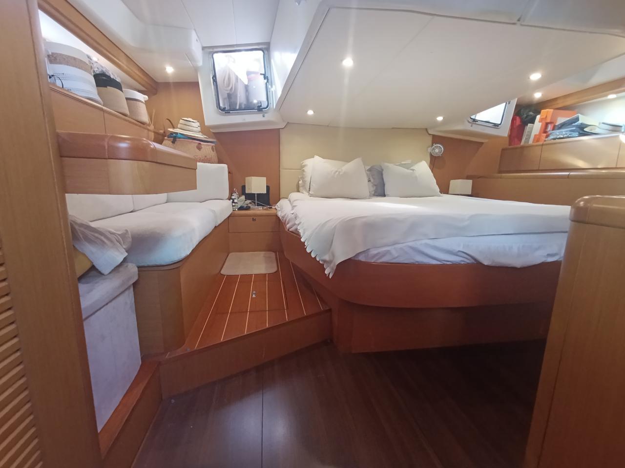 Une cabine propriétaire à l’arrière avec grand lit King size en ilot et cabine de douche