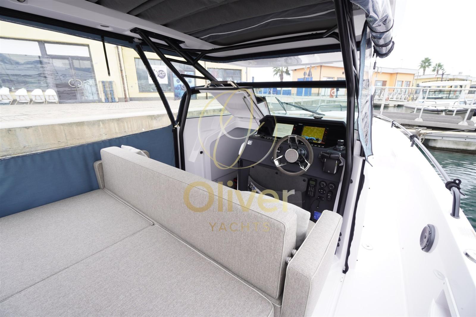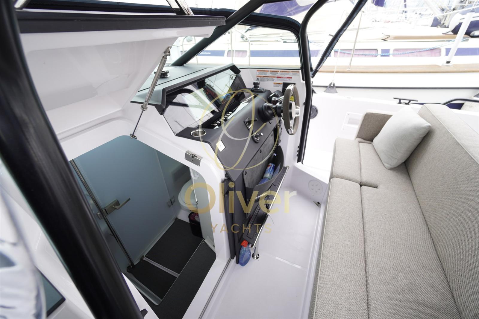 L’espace est étonnamment généreux pour un dayboat de cette catégorie : la couchette double offre de la place pour deux personnes et permet une utilisation pratique même pour des nuitées occasionnelles. L’environnement est lumineux grâce aux ouvertures latérales et aux matériaux sélectionnés, qui améliorent la perception de l’espace et maintiennent une sensation de qualité supérieure à bord.