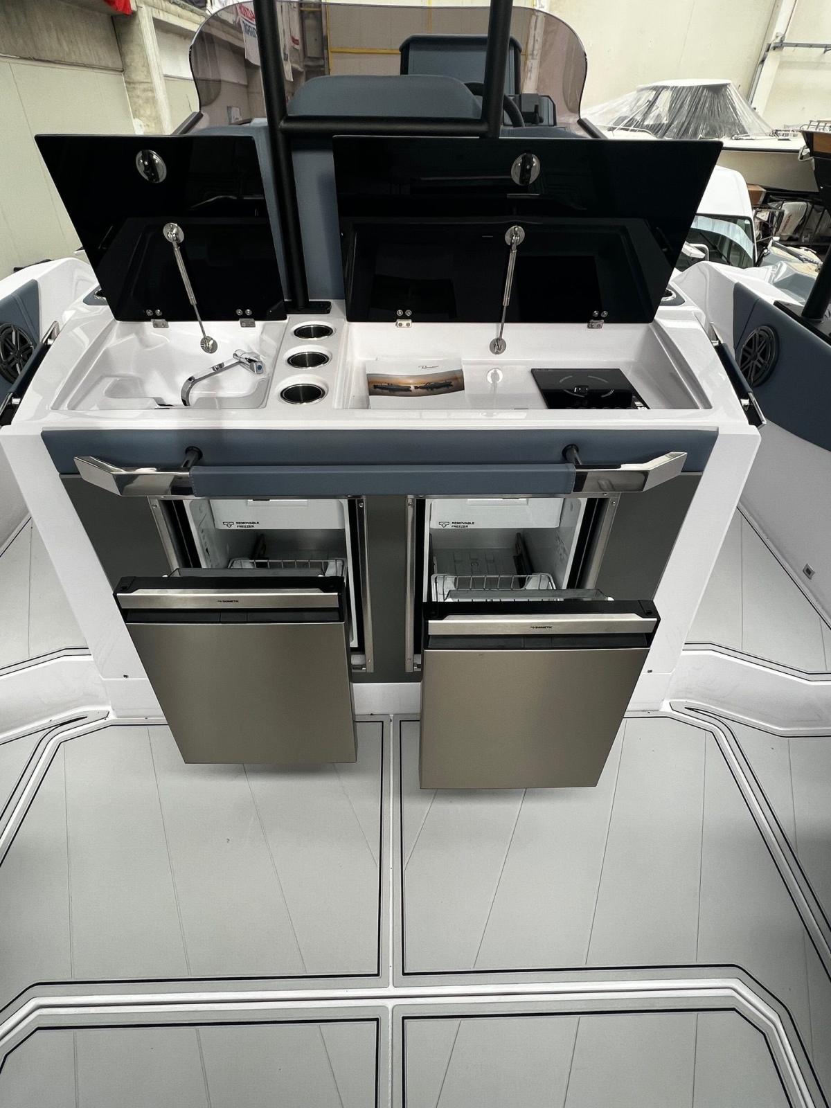GPS/ECO, treuil électrique, climatisation 12 V., système de batterie supplémentaire, direction hydraulique, ancre en acier inoxydable, propulseur d’étrave, pompe de cale double, kit LED int/ext, kit caméra avant, prise à terre 220 V avec chargeur de batterie, réfrigérateur double en acier inoxydable, etc. Cuisinière à admission avec onduleur, système de douche avec autoclave, sièges latéraux rabattables, pont de mer gris sur tout le pont, coussins complets, toit volant en PRV blanc avec extension arrière, aile en acier inoxydable, pont de mer, sellerie extérieure de luxe, console grise.