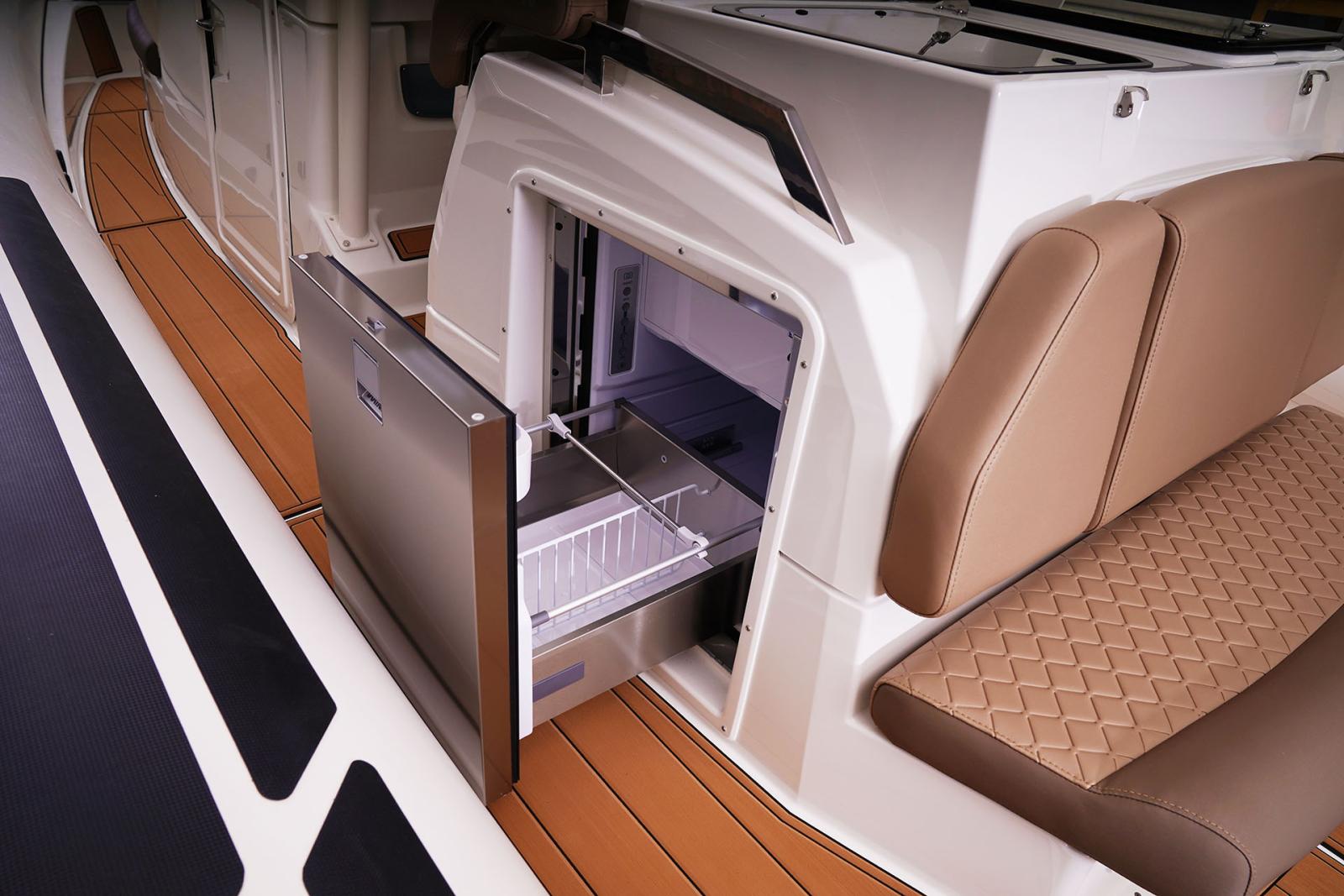 Avec ses 10,30 m, sa carène en V profond et sa double motorisation jusqu’à 2 x 350 CV, il offre une navigation stable, rapide et sécurisante.