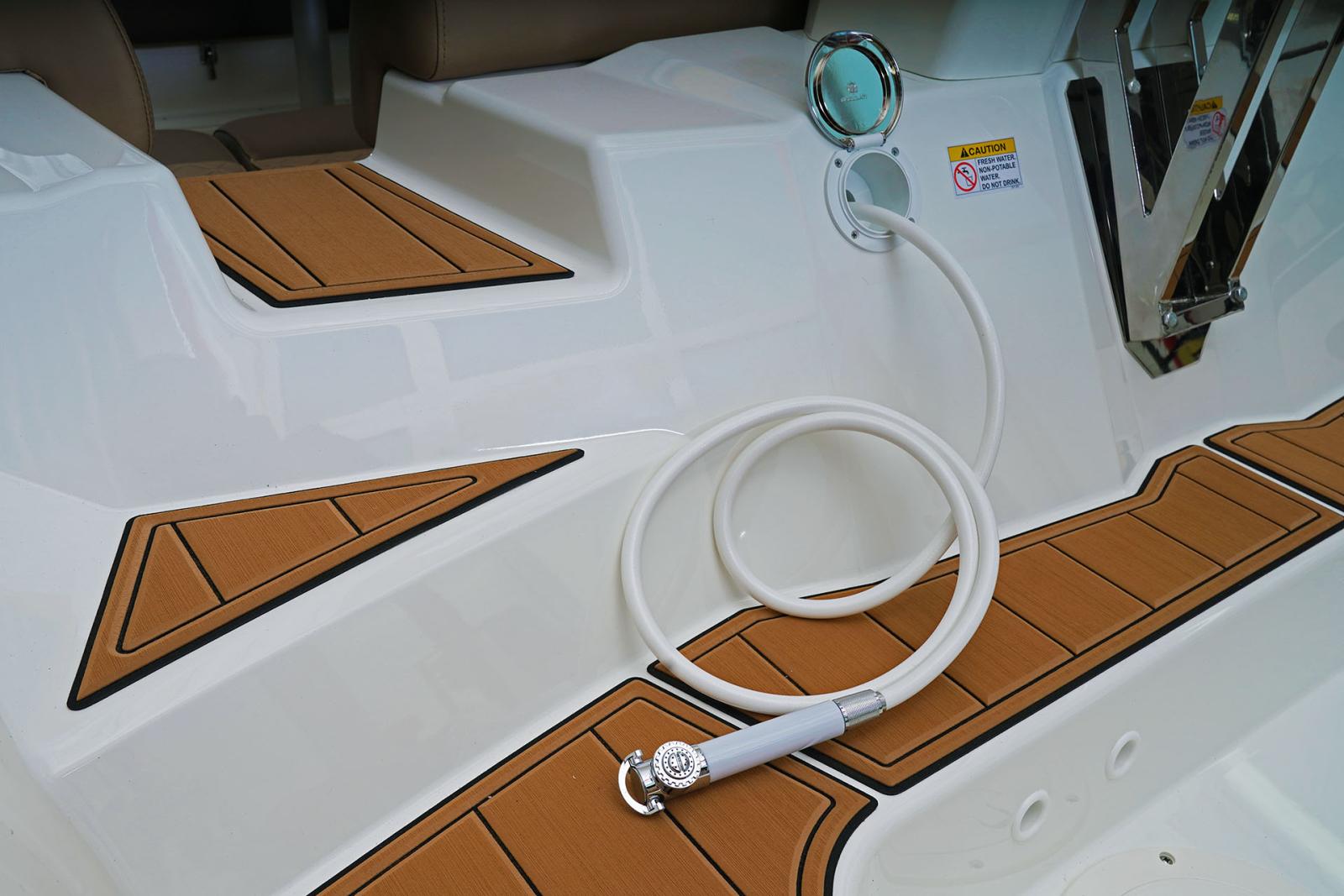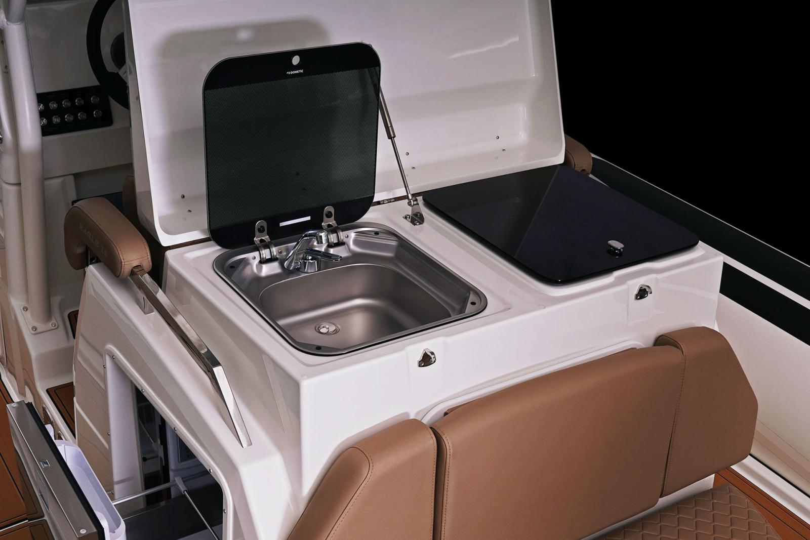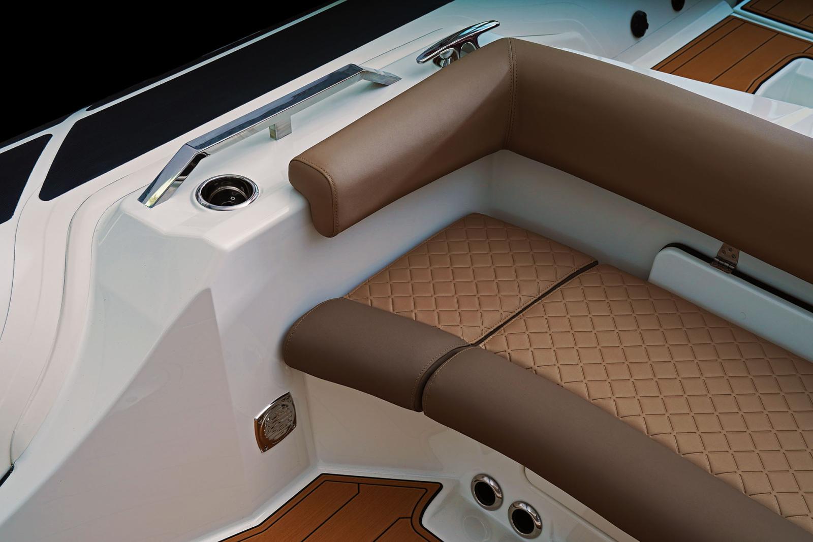Son grand carré arrière modulable, sa cabine double, son bain de soleil avant et sa kitchenette extérieure en font le semi-rigide idéal pour les sorties en famille ou entre amis.