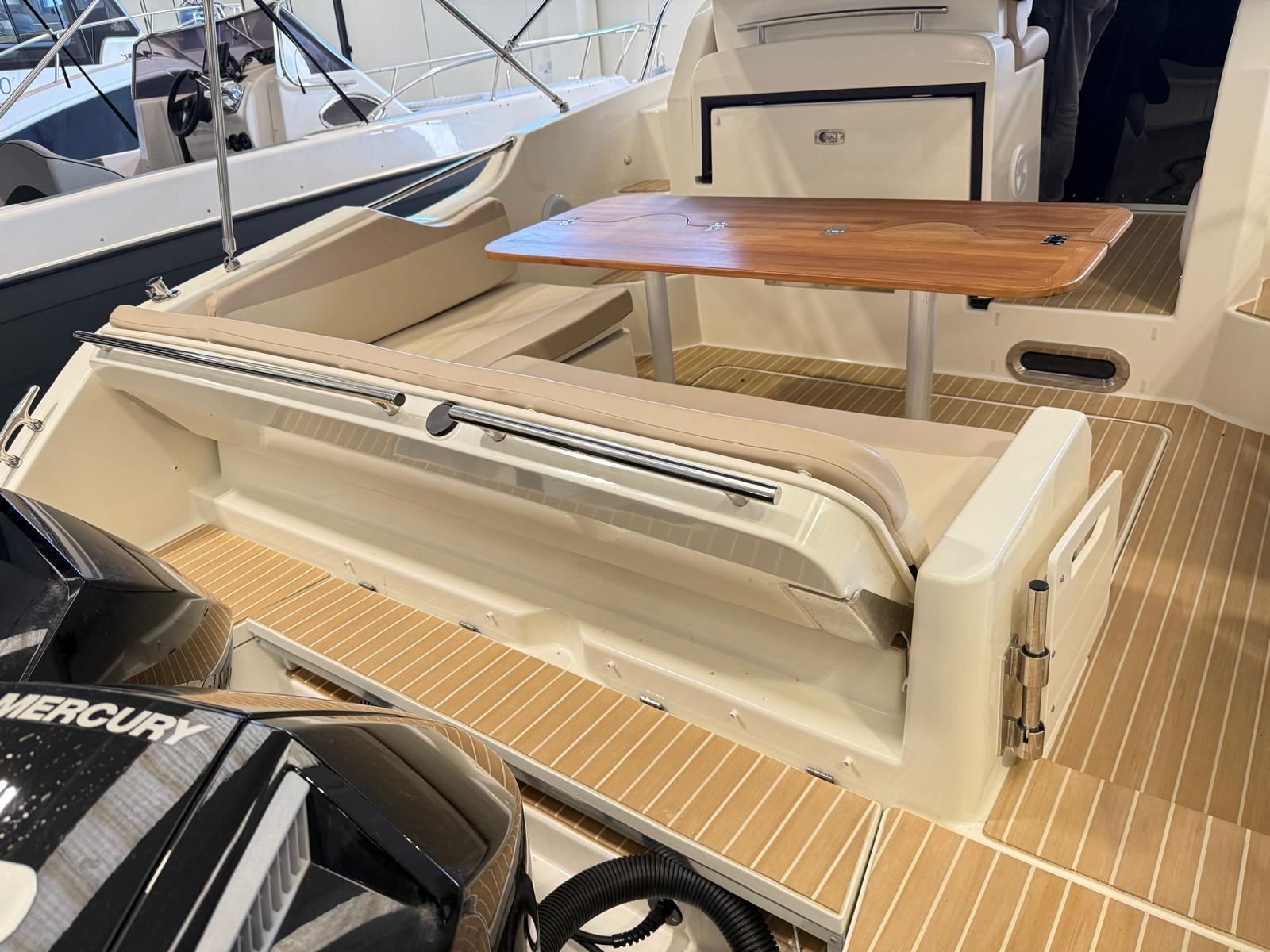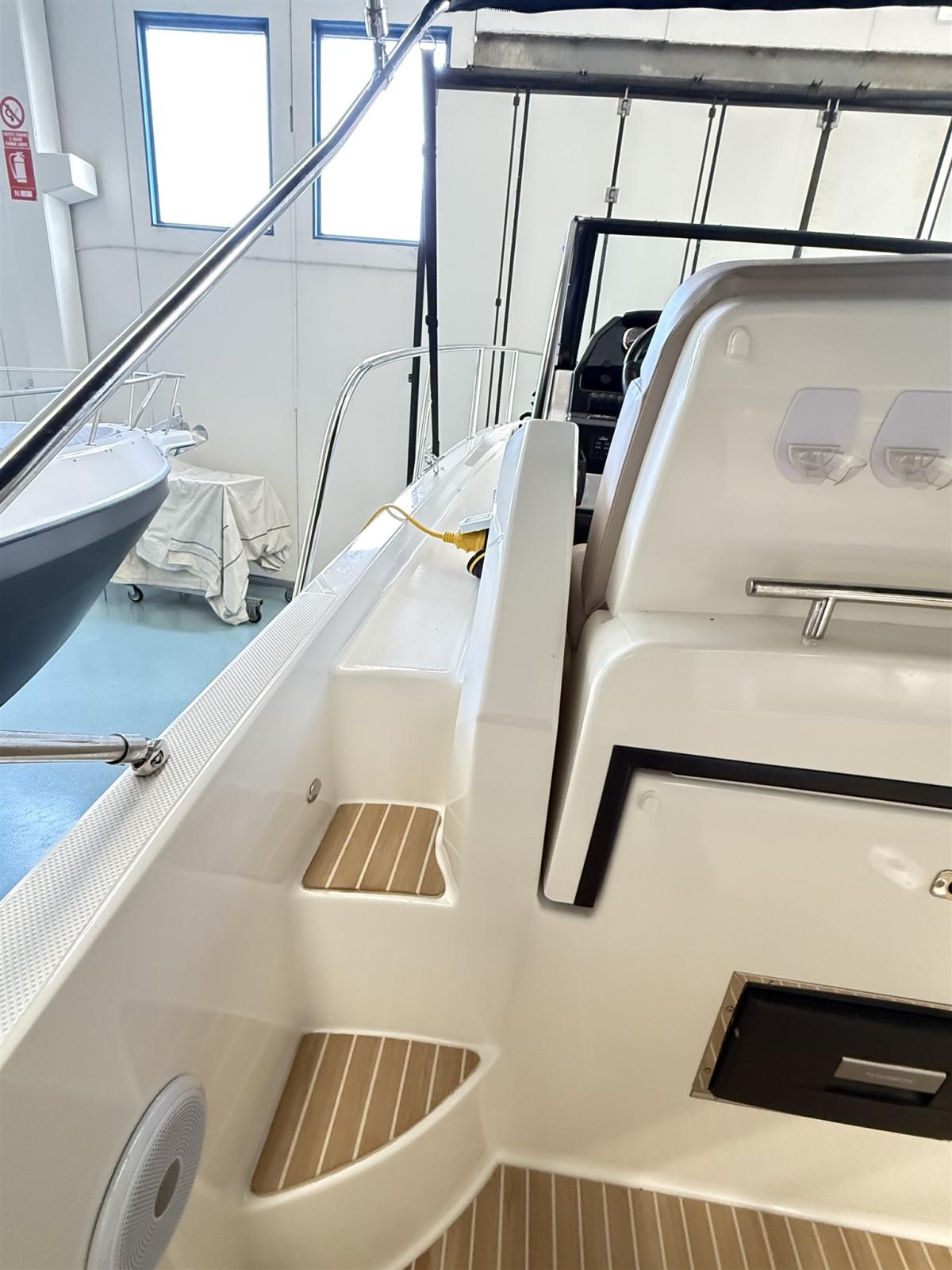 Alarme moteur, Eau sous pression, Câble d’alimentation à quai, Douche de cockpit, Flaps électriques, Indicateurs de flaps, Lavabo dans le cockpit, Éclairage de courtoisie, Défenses, Cockpit en teck (Flexiteek), Prise de quai, Connexion eau sous pression à quai, Guindeau électrique, Echelle de bain, table de cockpit, Corne.