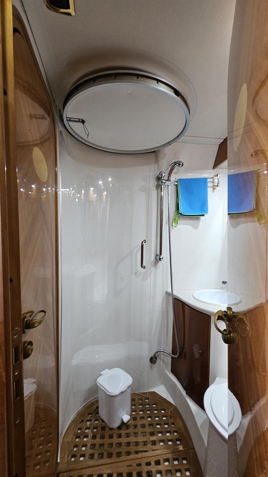 Douche de cockpit, Propulseur d'étrave (Vetus), Phare de poursuite, Flaps hydrauliques (N°2), Lavabo dans le cockpit, Passerelle (Idraulica), Plateforme arrière (di poppa con fondo in teak), Cockpit en teck, Connexion eau sous pression à quai, Rollbar, Guindeau électrique, table de cockpit.