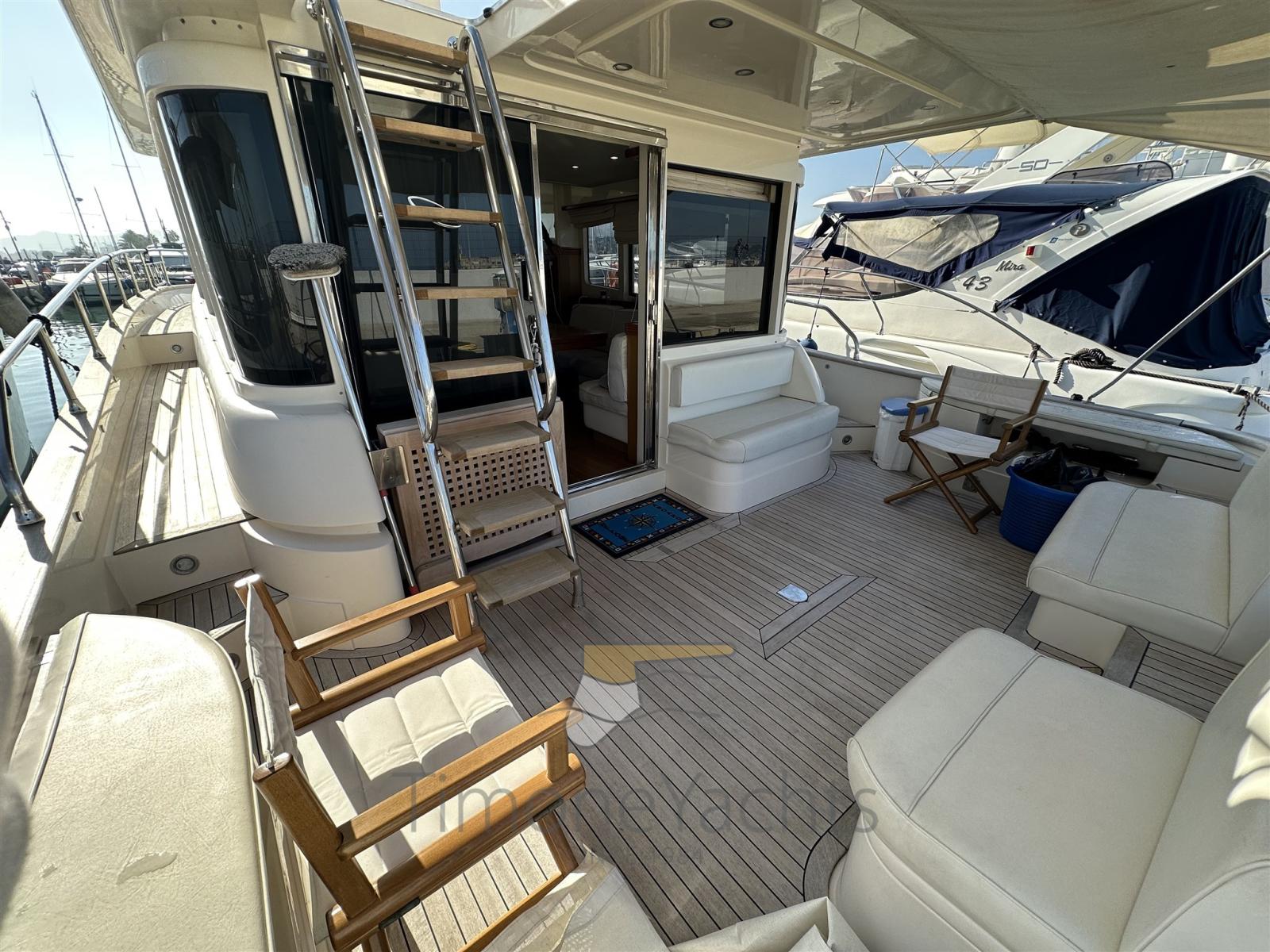 Le rouf est équipé de grandes fenêtres qui s’ouvrent verticalement et le pont principal abrite une confortable terrasse à l’avant, tandis que le flybridge abrite un deuxième bain de soleil et un coin dînette, avec canapé et table.
