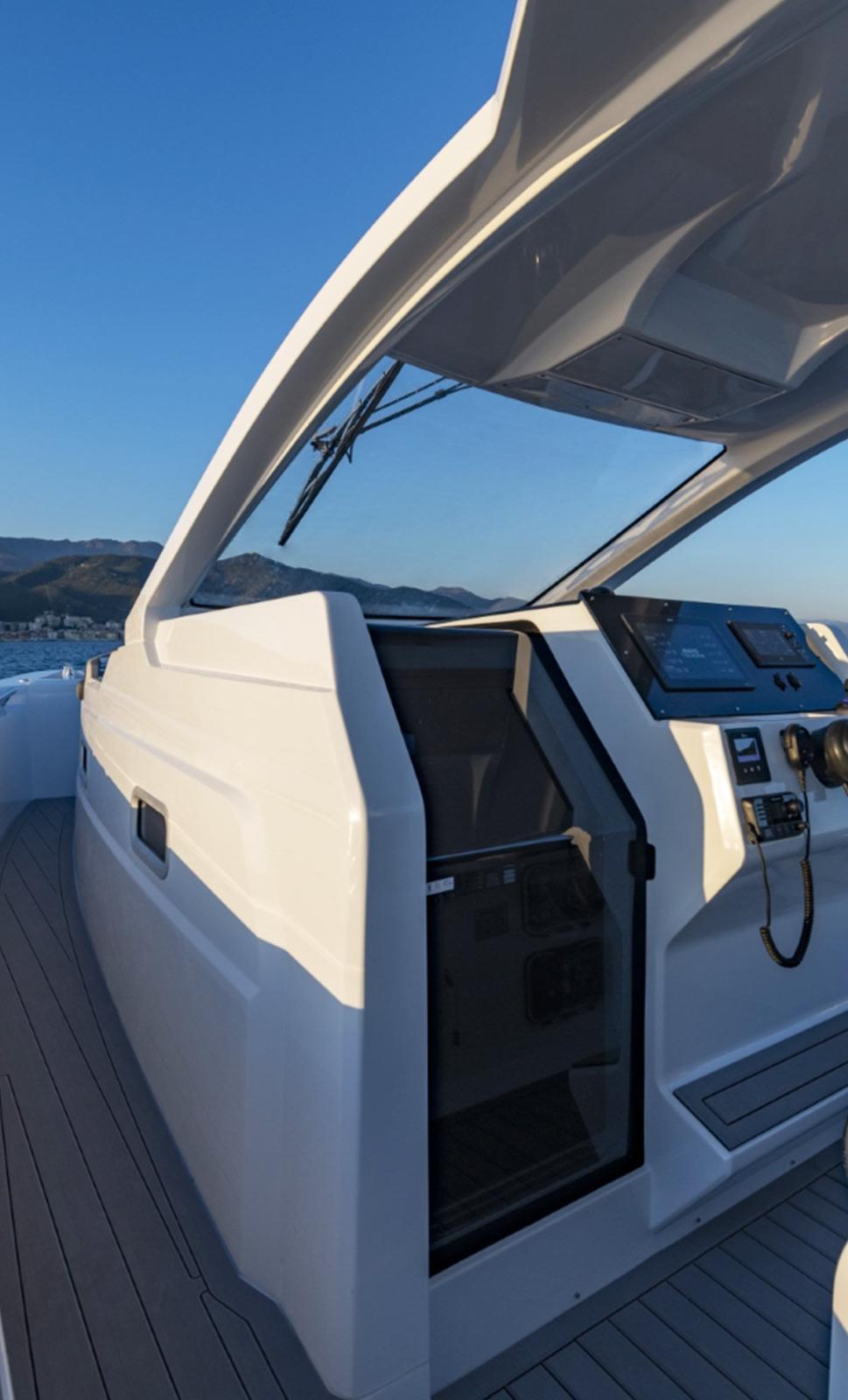 Alarme moteur, Alternateur, Ouverture du compartiment moteur électrique, Eau sous pression, Taquets pliants, Câble d’alimentation à quai, Douche de cockpit, Lavabo dans le cockpit, Éclairage de courtoisie, Spots sous-marins, Pompe de cale automatique, Prise de quai, Guindeau électrique, Echelle de bain, table de cockpit, Corne.