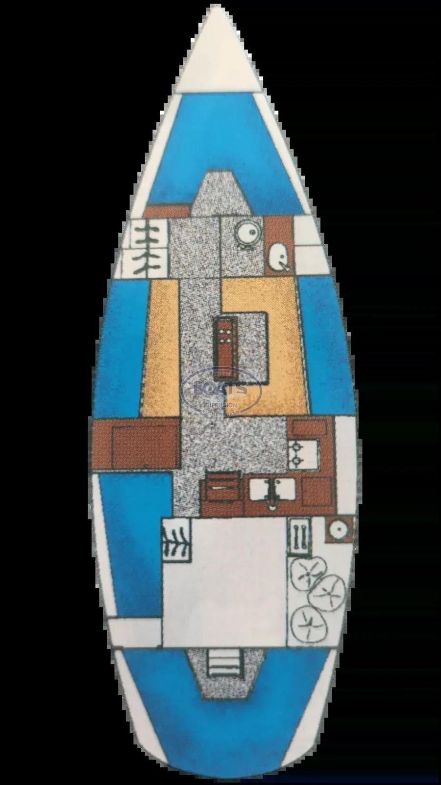 VISIBLE À LA ROCHELLE - CONTACTEZ JEAN-PIERRE OU AUDREY AU 06 09 42 34 55 - Le Gin Fizz de 1979, version à deux cabines, offre un agencement fonctionnel et spacieux. La cuisine en L fait face à une table à cartes avec couchette navigateur attenante. Le carré, particulièrement vaste, peut accueillir jusqu’à cinq couchages. À l’avant, on trouve les WC ainsi qu’une cabine double aménagée dans la pointe. La cabine arrière, totalement indépendante, est accessible par une seconde descente.