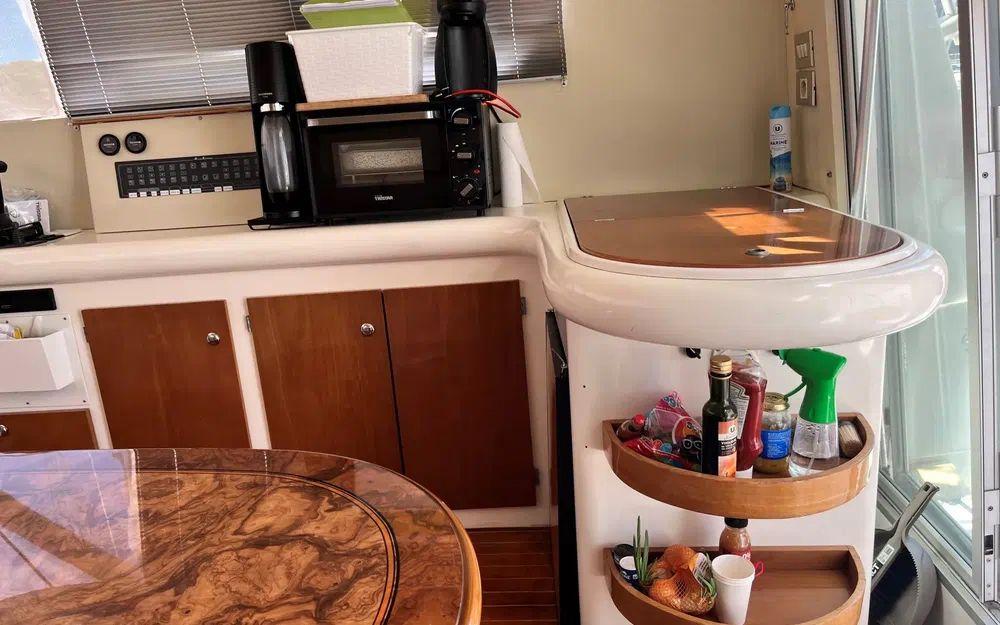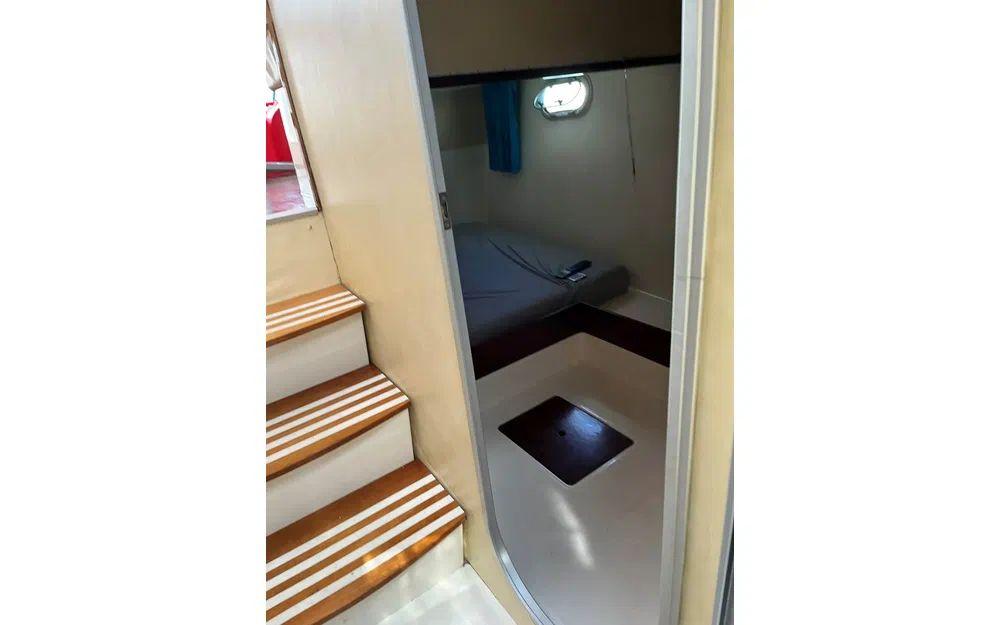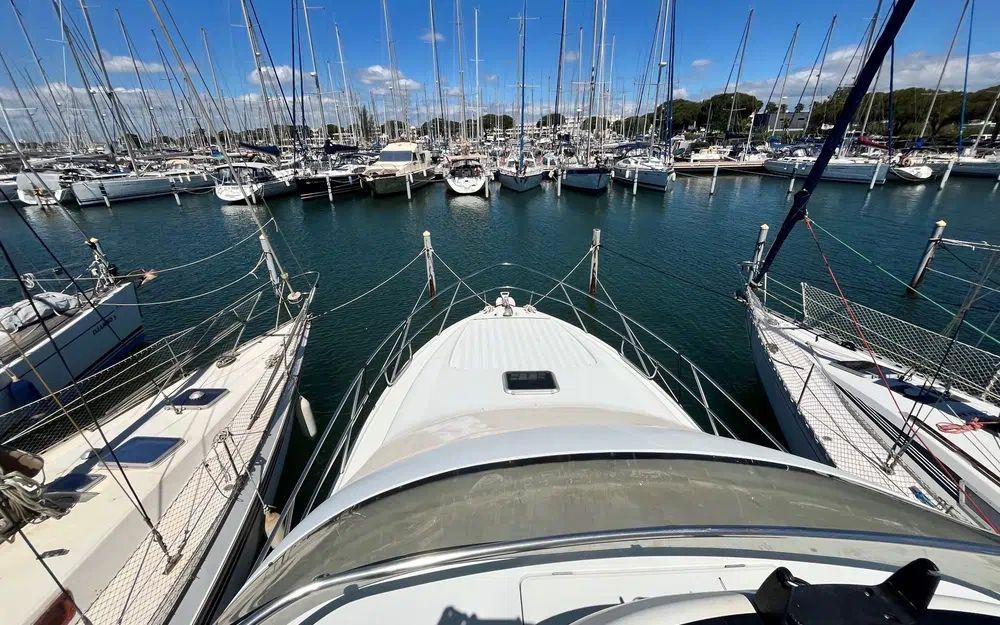 Avec sa longueur de 10,6 mètres sur 3,65 mètres de large, impossible de se marcher dessus ! Ses 2 cabines accueillent jusqu’à 6 couchages et la salle de bain offre tout le confort nécessaire pour partir plusieurs jours sans souci. Son agencement est pensé pour la vie à bord : placards nombreux, grand coin repas, bain de soleil à l’avant, fly bridge… Le cocktail parfait pour profiter de vos mouillages préférés !