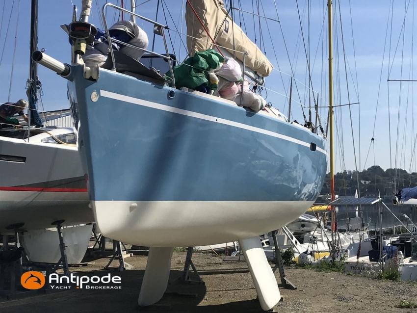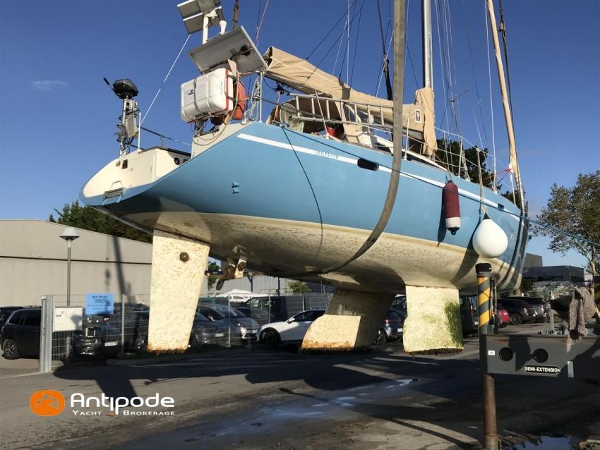 UNIVERSAL YACHTING 40, 2001, NANNI 4220 HE, 50 cv (1850 h), Version roof court, Peinture coque et pont 2018, Version d'aménagement intérieur 1 cabine avant, 2 cabines arrières, 1 cabinet de toilette et douche, Plexis roof 2018, Support radeau de survie dans les balcons, Assises de cockpit lattées teck, Barre franche + stick, Capote de roof - 2011, Taud de soleil, Guindeau électrique, Support moteur hors-bord, Mât aluminium 2 étages posé sur le pont, Echelons de mât 2025, Gréement dormant câble monotoron - 2013, Grand-voile full batten Dacron 3 ris - 2017, Rail de guindant de grand voile + chariots de lattes - Facnor 2013, Enrouleur de génois avec tambour sur le pont - Profurl, Génois sur enrouleur triradial - 2017, Etai largable avec système de tension, Voile de brise pour étai largable, Tangon aluminium avec système de stockage le long du mât, Spinnaker + chaussette - 110 m2 / sqm, Gennaker sur emmagasineur - 90 m2 / sqm, Pilote automatique in board Raymarine, Centrale de navigation Raymarine ST 60, Radar avec radôme sur support de mât - Furuno, Transpondeur AIS (émetteur récepteur), VHF à la table à carte, VHF portable, Unité réfrigérante 12 V ouverture par le dessus, Eau chaude et froide sous pression, Gazinière 2 feux + four, Prise de quai 220 V + chargeur de batteries, Batterie moteur - 2025, Batteries service X 5 2025, Chauffage WEBASTO, WC LAVAC 2015, Réservoir gasoil dans les quilles 2 X 150 l refaits 2024, Radeau de survie 6 p