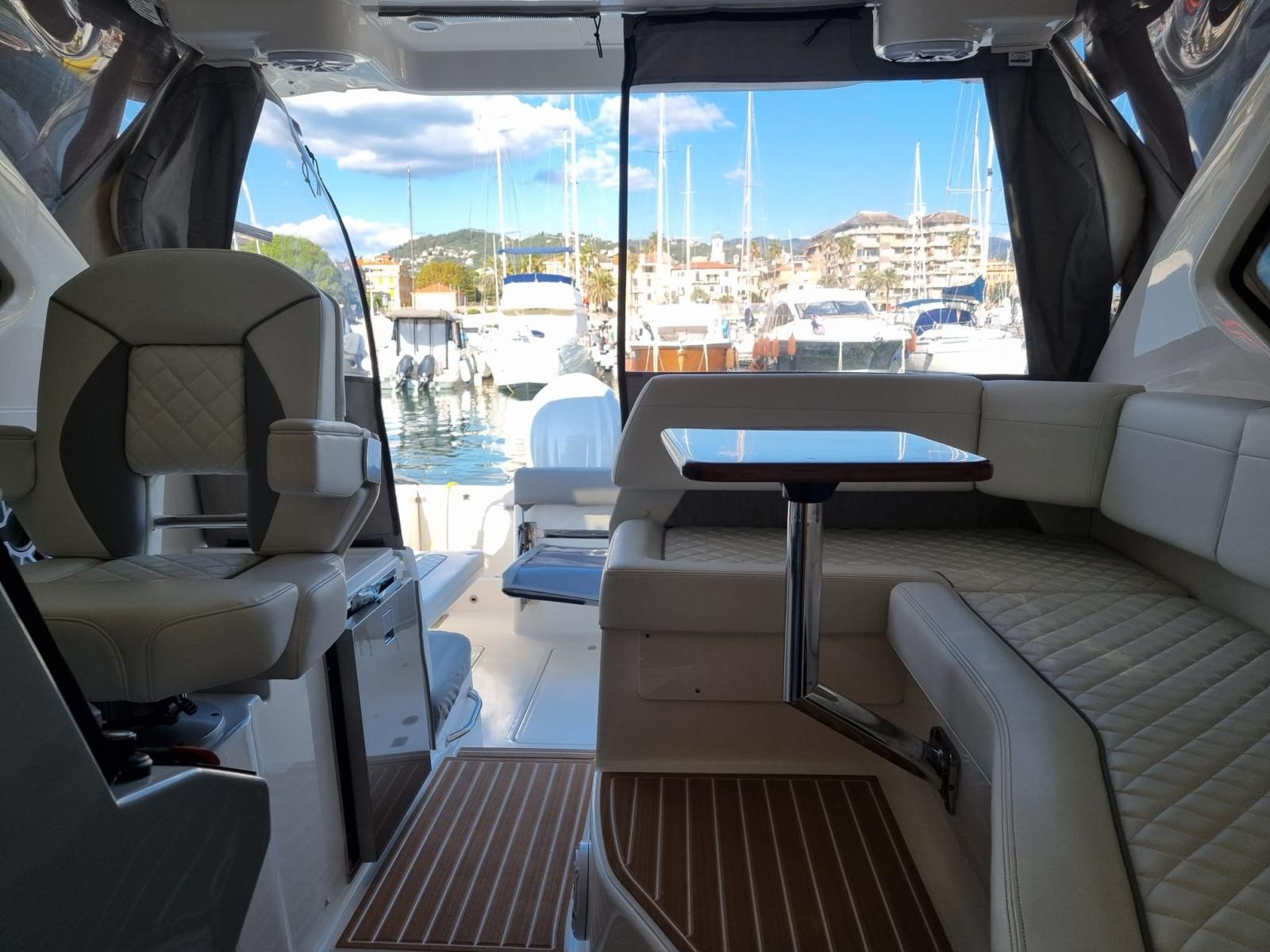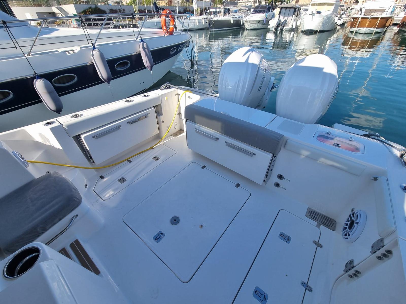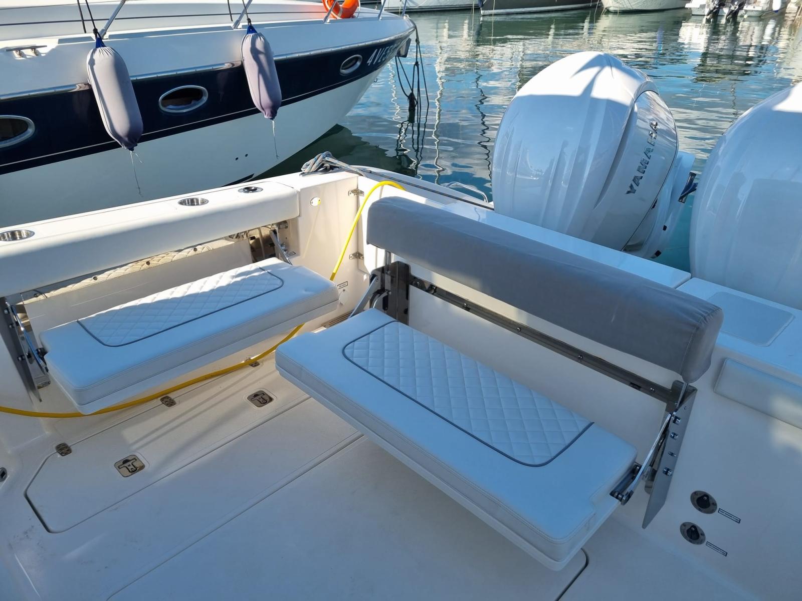 Alarme moteur, Alarme de pompe de cale, Alternateur, Ancre (CON 75 METRI CATENA INOX 316L), Eau sous pression, Câble d’alimentation à quai, Douche de cockpit, Flaps électriques, Indicateurs de flaps, Lavabo dans le cockpit, Éclairage de courtoisie, Spots sous-marins (RGB), Plateforme arrière, Pompe de cale automatique, Pompe de cale manuelle, Porte latérale (+ SCALETTA TIPO "SCUBA DIVING"), Cockpit en teck (SINTETICO), Prise de quai, Guindeau électrique, Echelle de bain, table de cockpit, Corne.