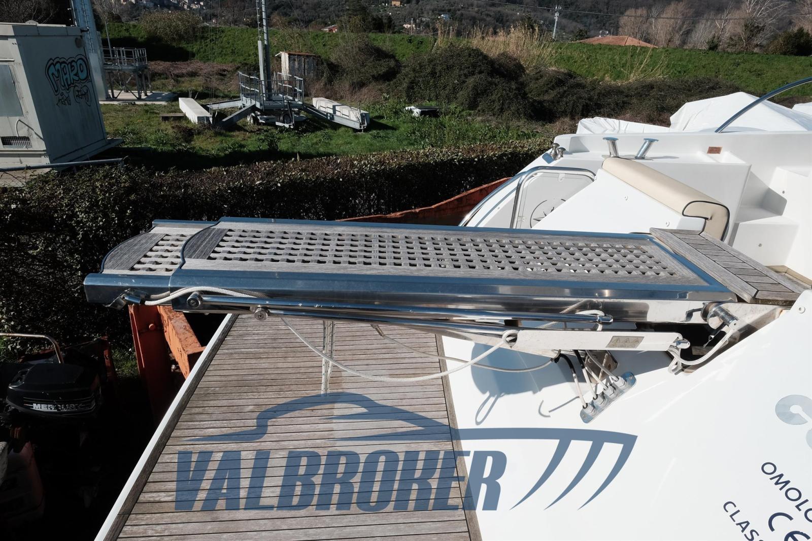 Eau sous pression, Douche de cockpit, Spots sous-marins, Passerelle (teak), Plateforme arrière (teak, estesa), Porte latérale, Cockpit en teck, Guindeau électrique, Table pliante de salon, Winch électrique arrière.