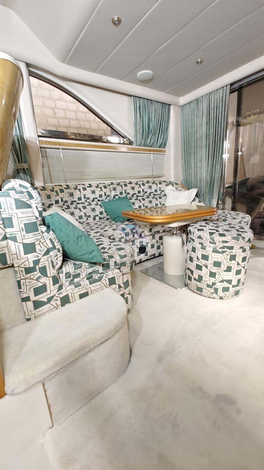 Intérieurs : Les intérieurs sont luxueusement conçus, offrant confort et élégance. Il y a une cuisine bien équipée, un salon avec des sièges et des fenêtres panoramiques, et plusieurs cabines.