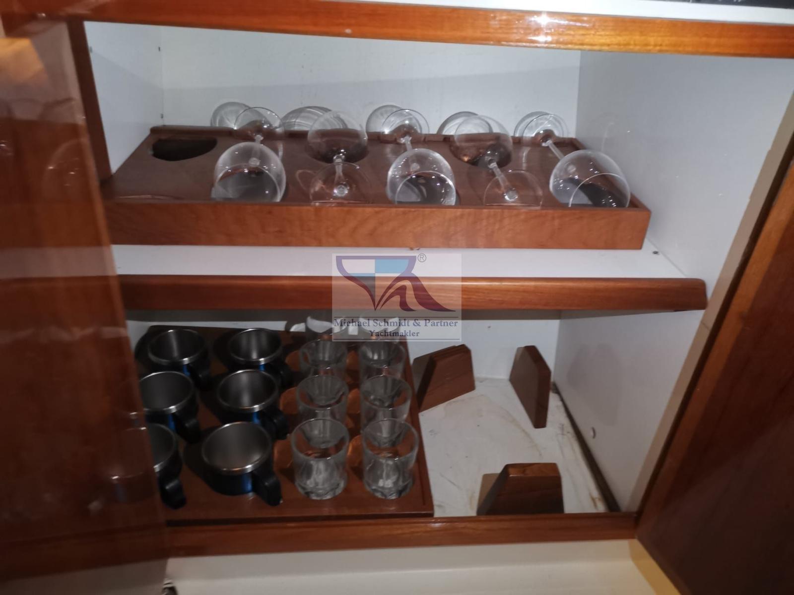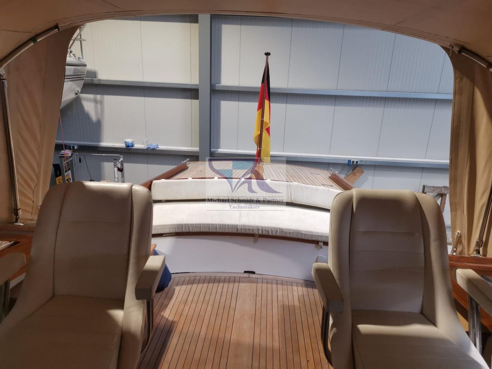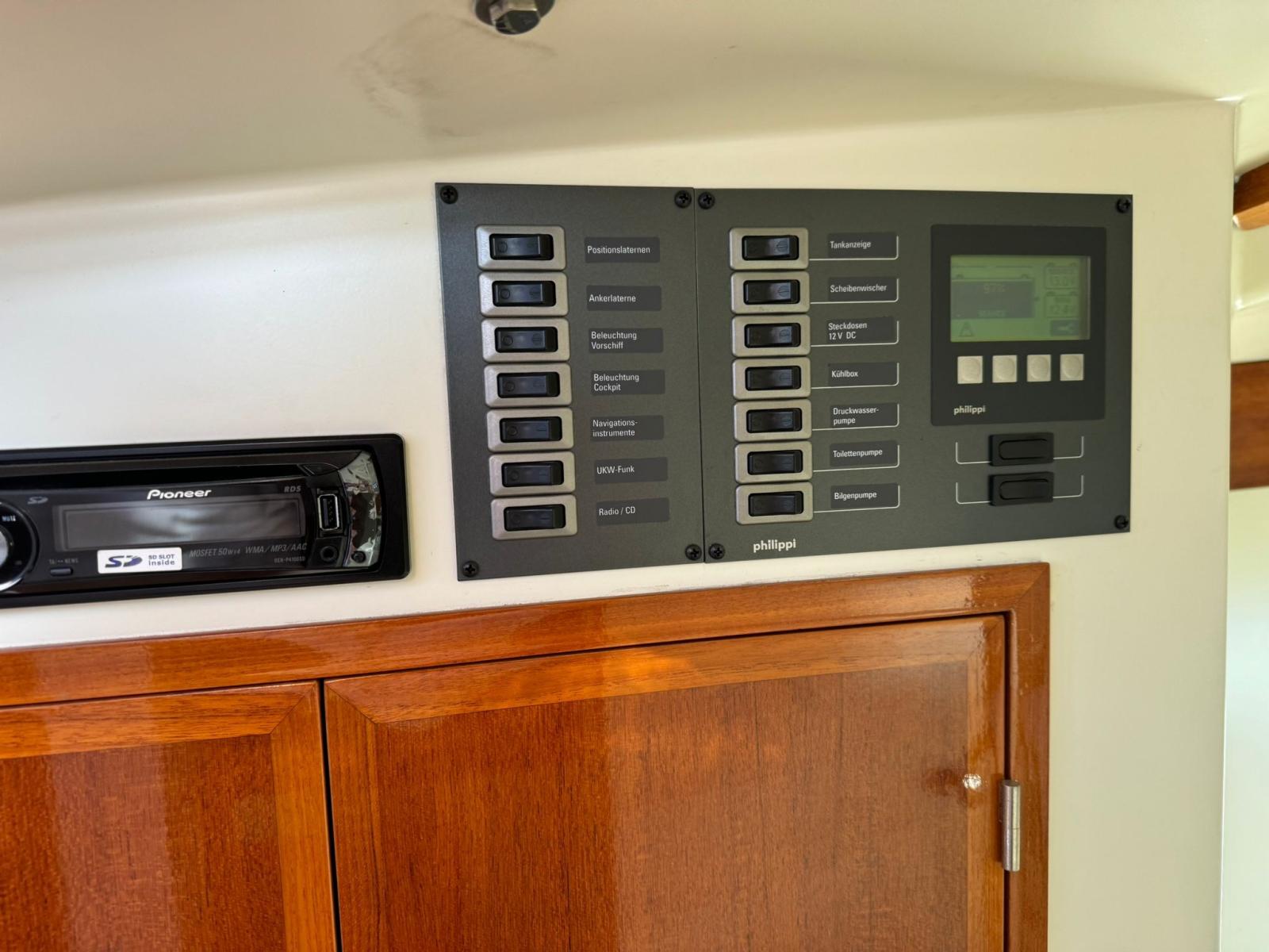 Alarme moteur, Eau sous pression, 3 Batteries, Passavant en teck, Câble d’alimentation à quai, Phare de poursuite, Flaps électriques, Moniteur de batterie, Défenses, Pompe de cale automatique, Cockpit en teck, Prise de quai, Echelle de bain, table de cockpit (Teak, kann in der Maschinenraumklappe gestaut werden), Pont en teck.