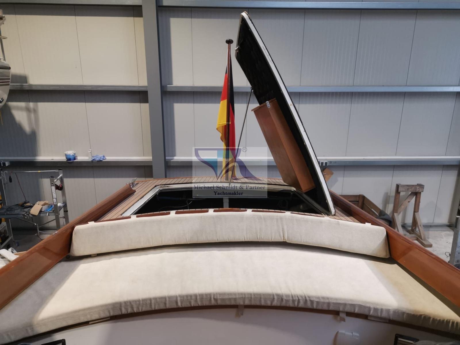 Le KIEL LEGEND est un pur euphémisme. Derrière la coque en teck fin, en acier inoxydable poli et en cuir blanc se trouvent deux moteurs diesel Volvo Penta de 170 ch chacun, qui accélèrent le speedster de 8,80 m à plus de 40 nœuds.