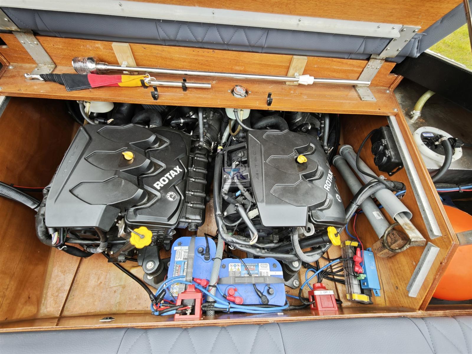 Trim hydraulique, 2 Batteries (2 x 60 AH), Câble d’alimentation à quai, Pont en teck, Prise de quai.