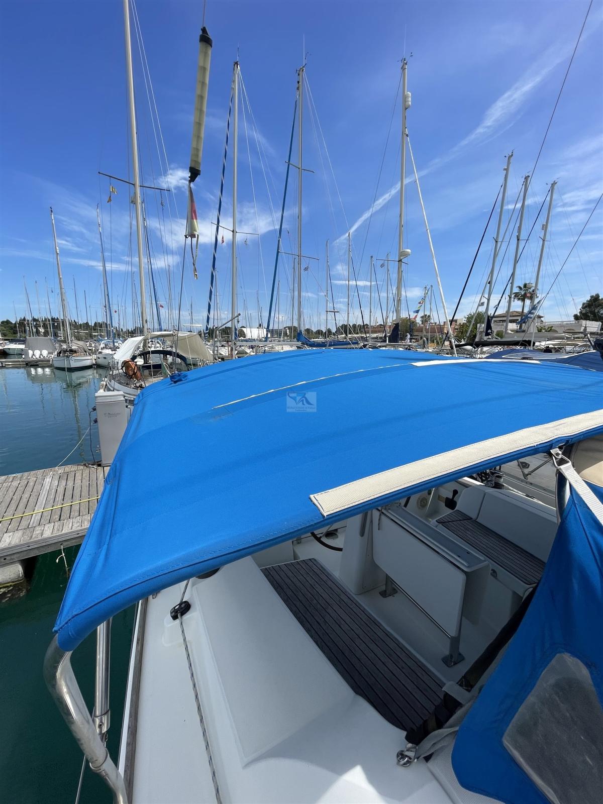 Eau sous pression, 3 Batteries (1x 12V 70 Ah, 2 x 70 Ah), Douche de cockpit, Phare de poursuite, Plateforme arrière, Pompe de cale automatique, Pompe de cale manuelle, Prise de quai (220V), Connexion eau sous pression à quai, Guindeau électrique, Echelle de coupée, Echelle de bain, Chaise support HB, table de cockpit, Annexe (für 4 Pers. mit Außenborder), 2 Filières avec sortie latèrale, Corne, 3 Winch (1 und 2 x Genua, Harken), Windex.