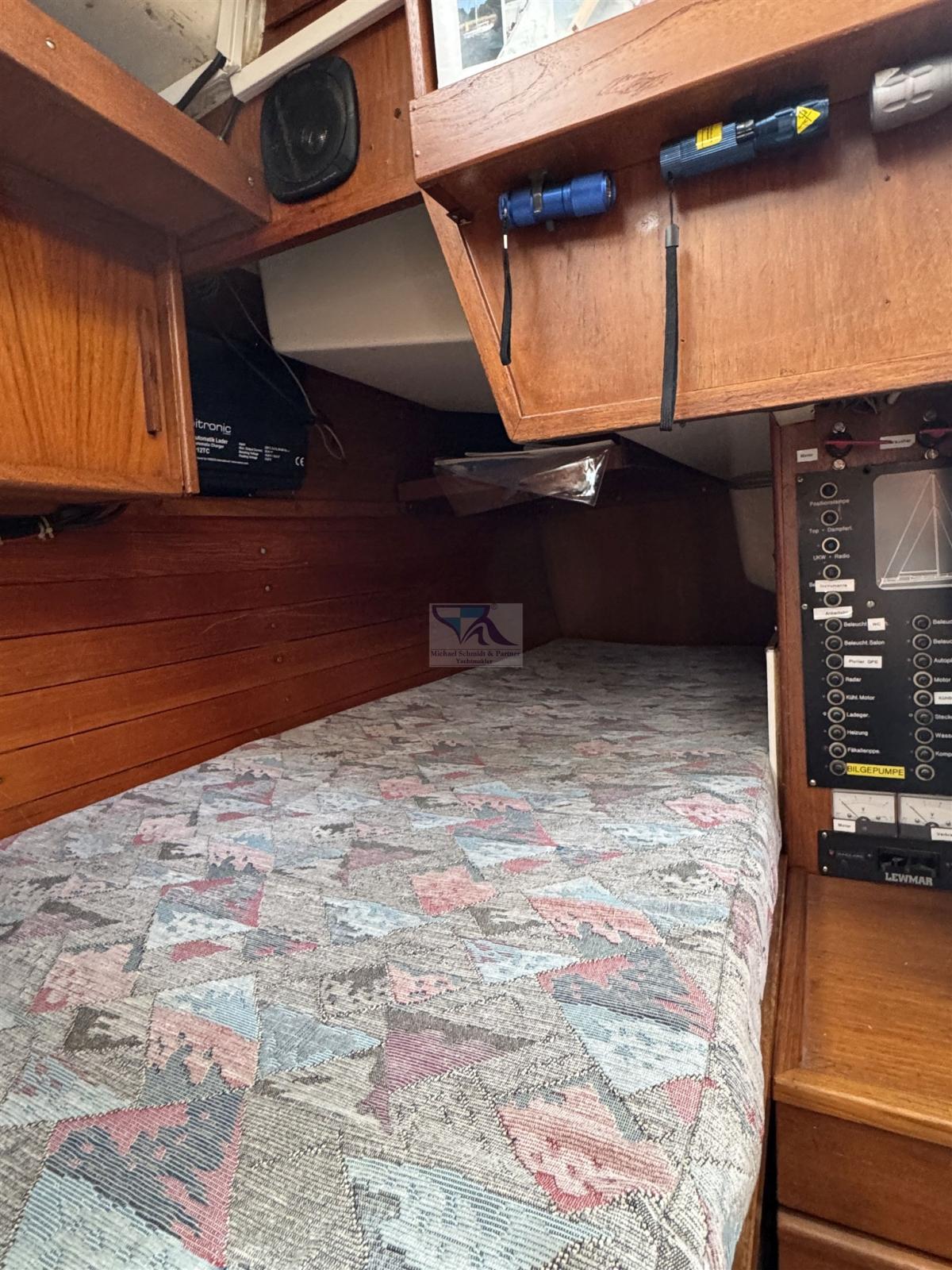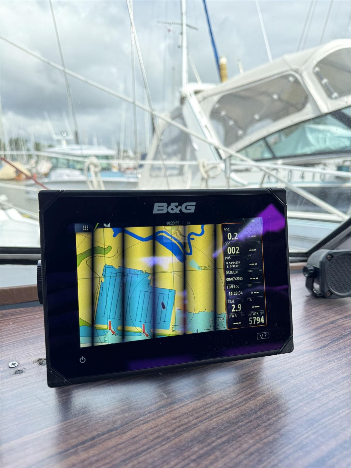 Sondeur pêche (B&G Airmar DST 810 Neu 2025), Loch (B&G Airmar DST 810 Neu 2025), Pilote automatique (Raymarine), Lecteur de cartes (B&G Vulcan 7 aus 2016), Radio VHF (B & G V50 auf VDES 2024 umprogrammiert, Kabel und Antenne neu 2017)), Anémomètre/Girouette (B&G aus 2017).