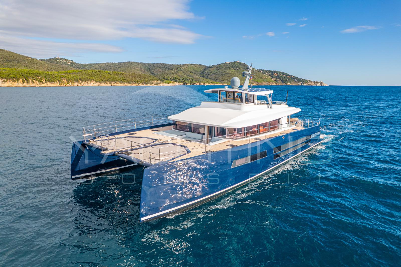 Propulsé par deux moteurs de 500 ch, le yacht atteint une vitesse de croisière de 11 nœuds et peut filer jusqu’à 18 nœuds. Sa conception légère permet de réduire la puissance moteur nécessaire, limitant ainsi la consommation de carburant tout en offrant une autonomie transatlantique remarquable. Gage de qualité et de solidité, la construction répond aux exigences d’immatriculation du navire au RIF ou au MCA. Première mise en service 2021