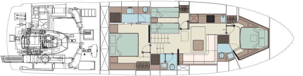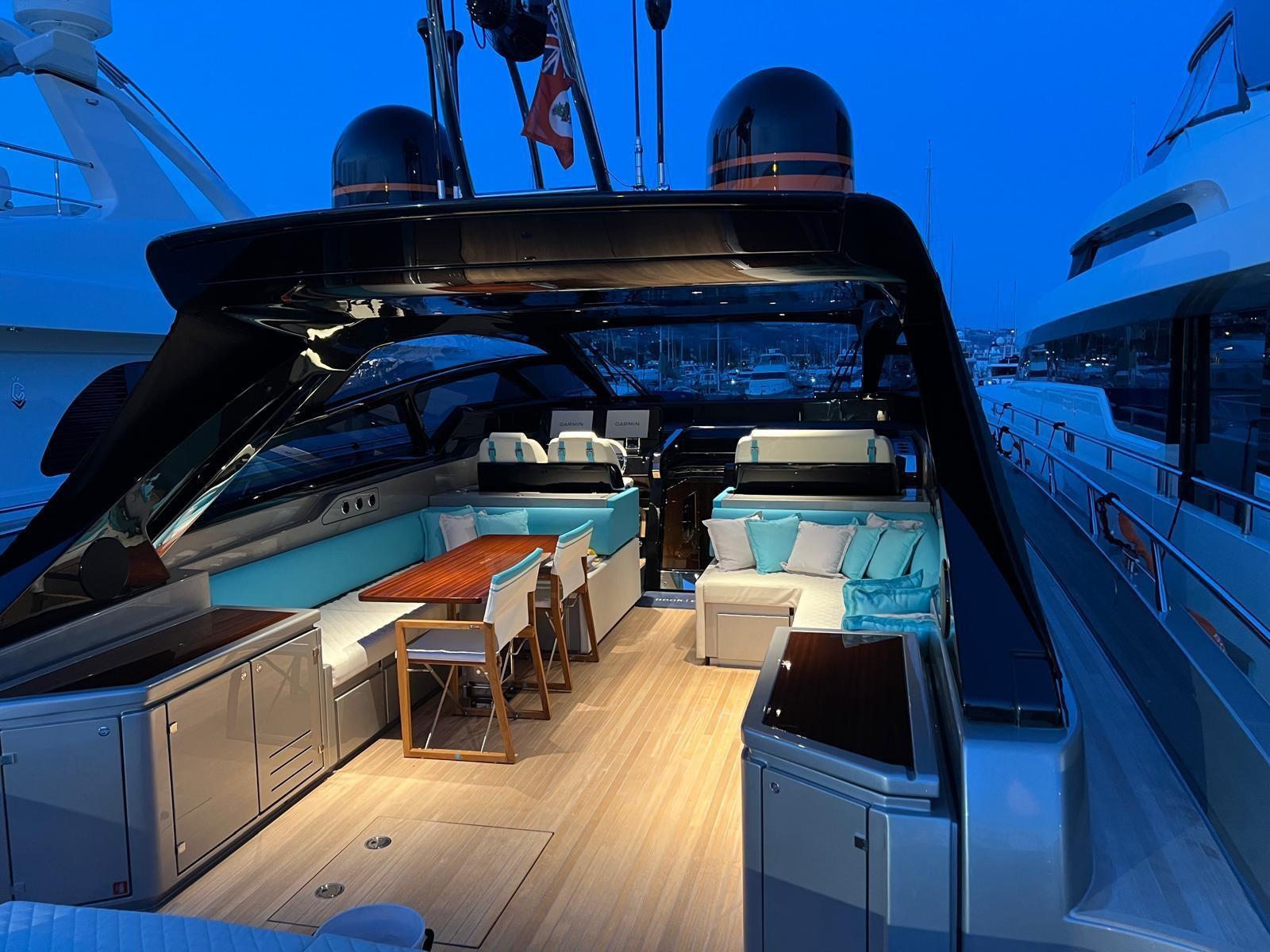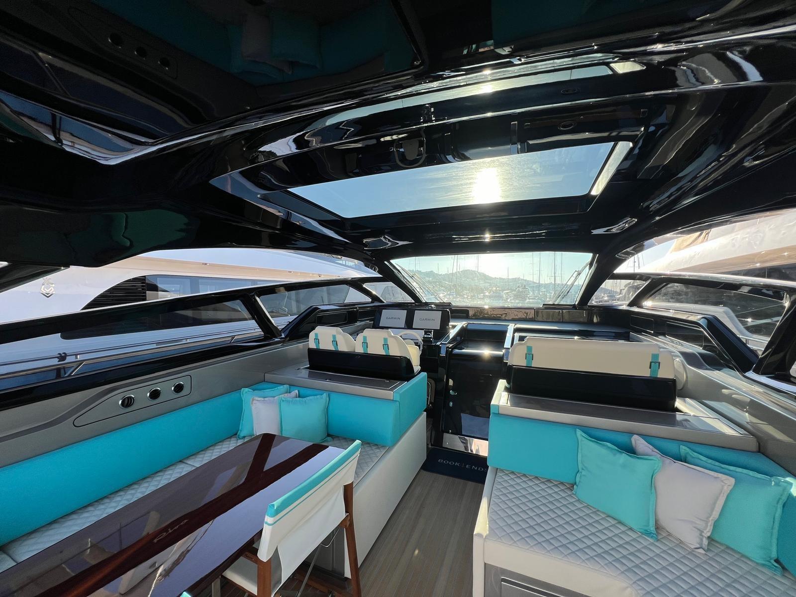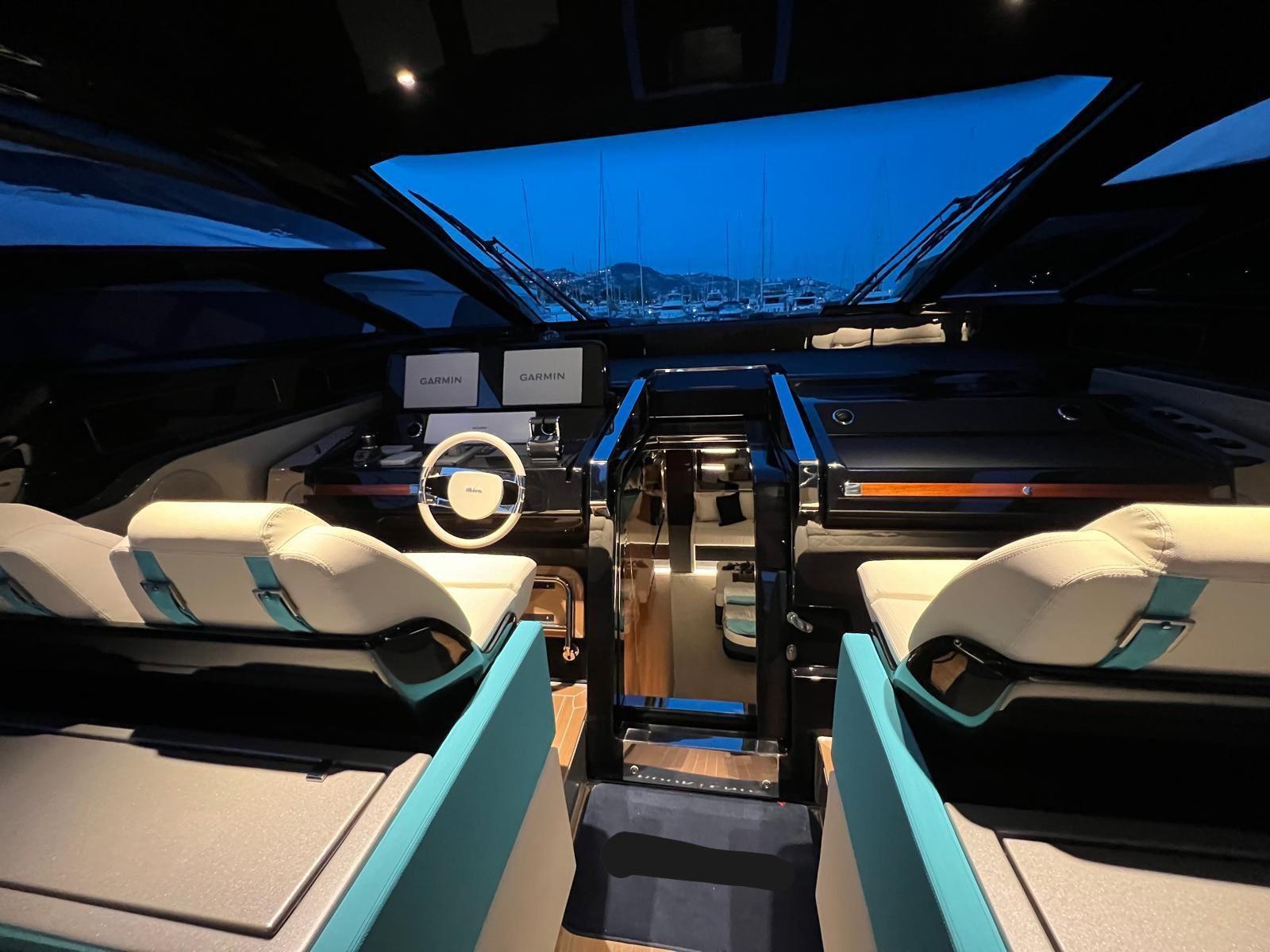 Les espaces extérieurs sont conçus pour la détente et la convivialité, tandis que les intérieurs abritent trois cabines raffinées, une cabine d’équipage et trois salles de bains, agrémentées de finitions en bois de wengé chocolat. Le confort moderne ne manque pas à bord : climatisation, stabilisateur Seakeeper NG9, système audio haut de gamme, dessalinisateur et TV avec Apple TV.