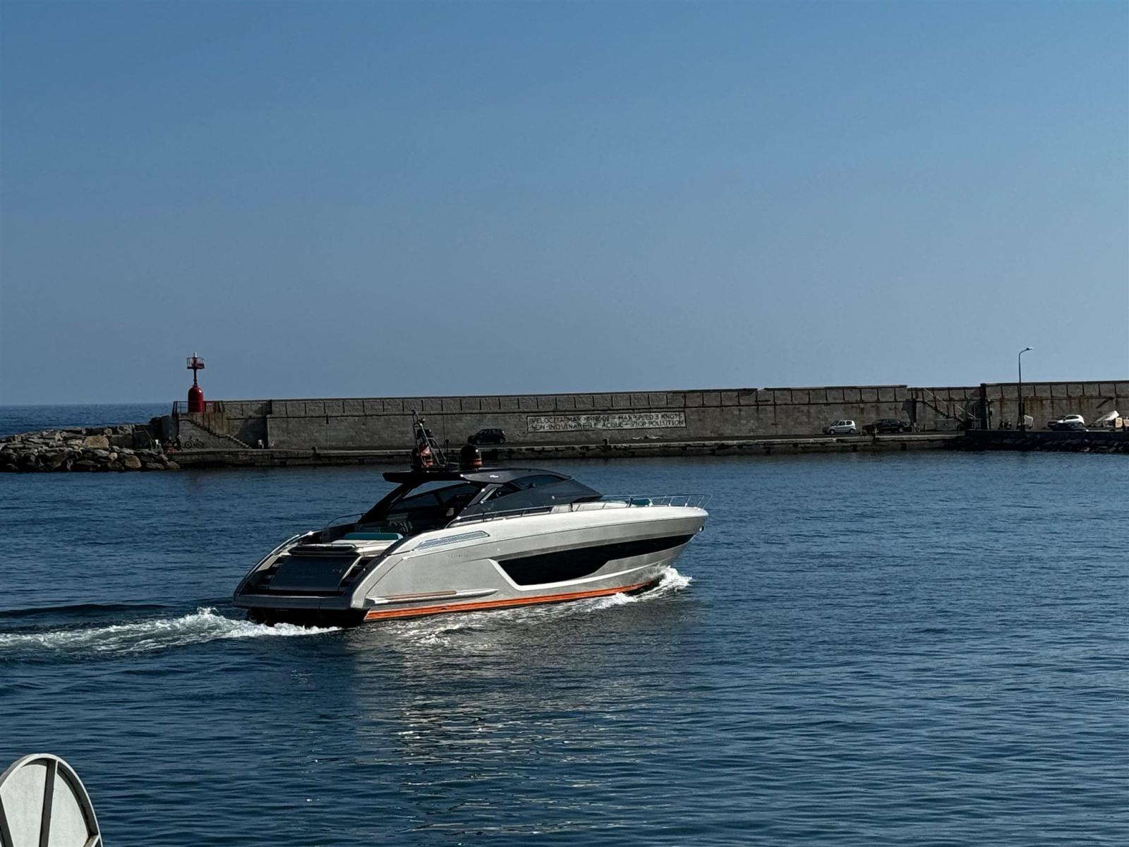 Fabriqué en fibre de verre avec une élégante finition Riva Silver, le yacht peut accueillir jusqu’à 16 personnes.