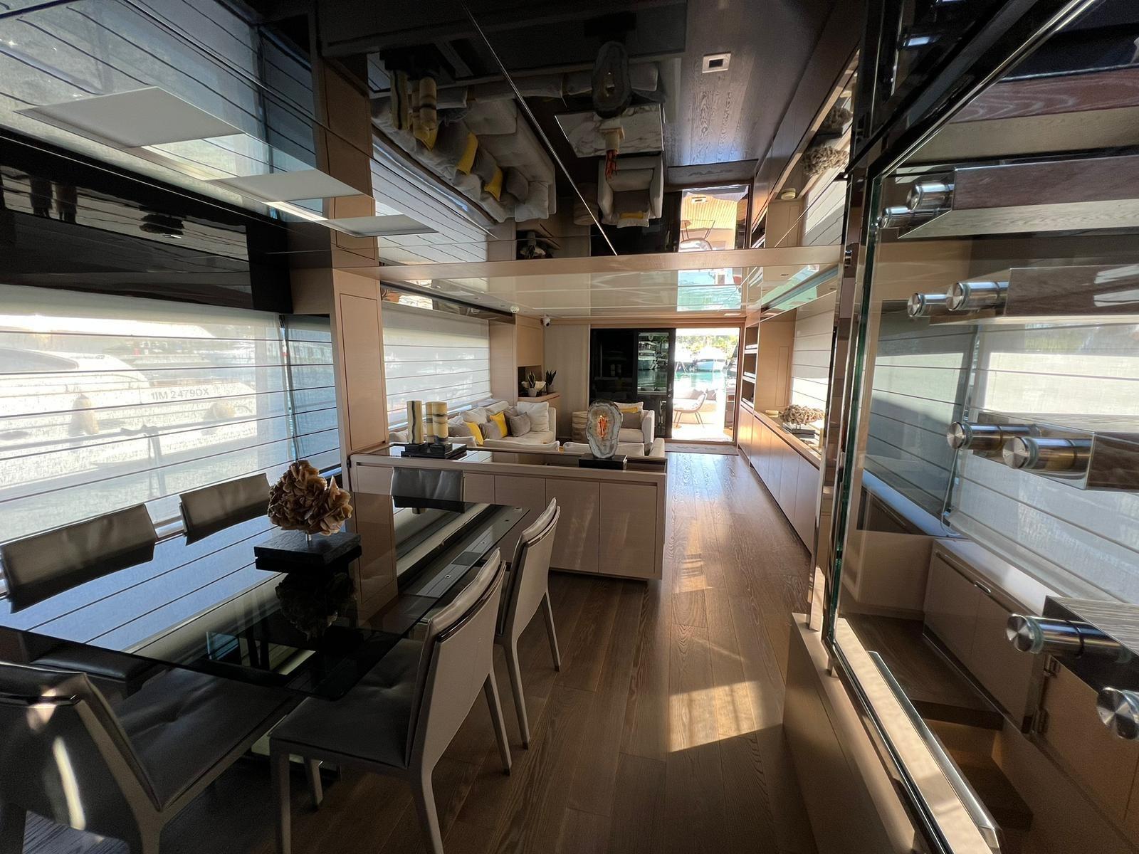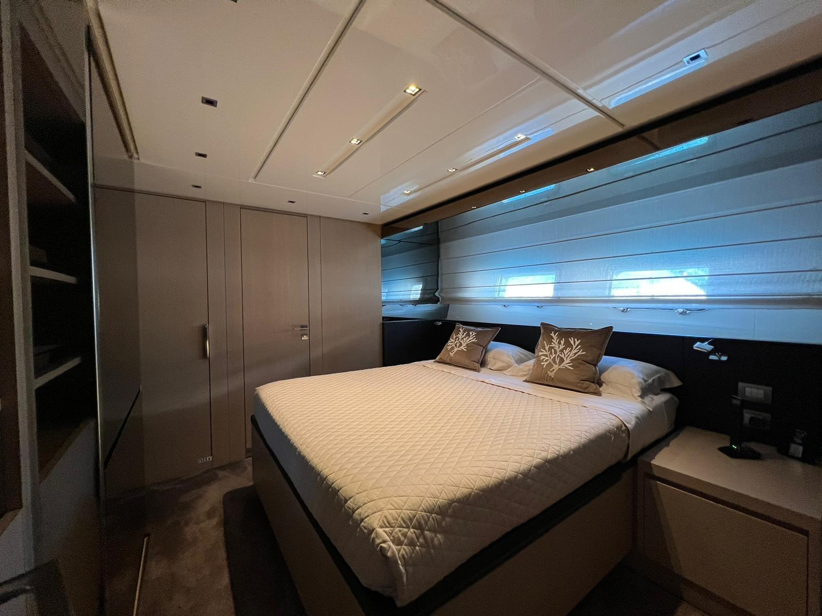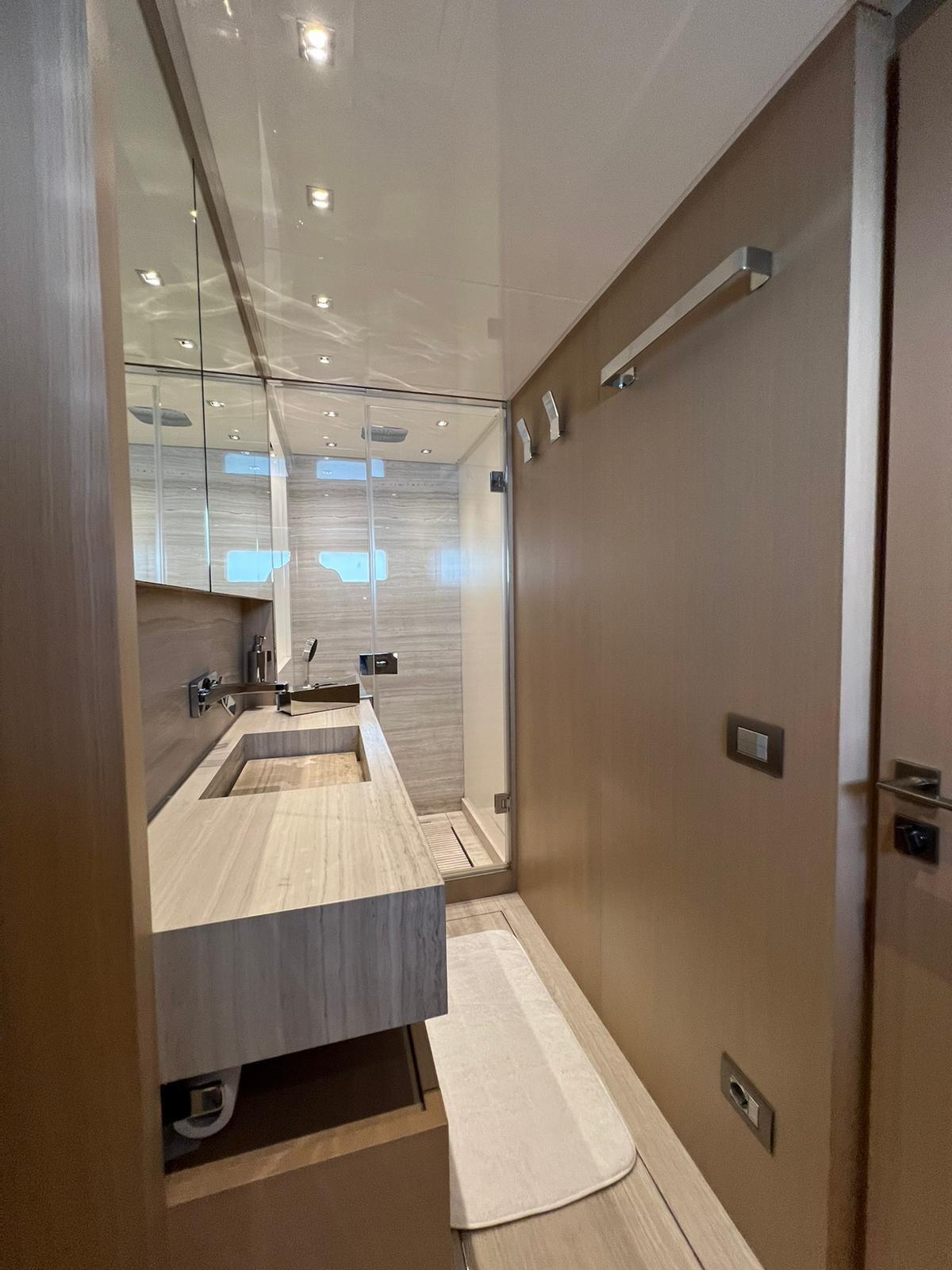 Eau Chaude, BBQ/ Grill (Fly), 2 Ballon d'eau chaude, Air Conditionné, Connexion à internet, Contrôleur domotique, Dessalinisateur (300 LT Ora Idromar), Cuve à eaux noires, Jauge de Réservoir d’Eau, Jauge de Réservoir d’Eaux Usées, Plancher intérieur en bois (Zona Dinette), Réservoir d'eau noire (400LT), Caméra vidéo (Garage, plancia, Salone, Poppa, Laterali,Fly), Interphone, Caméra infrarouge, Toilettes électriques.