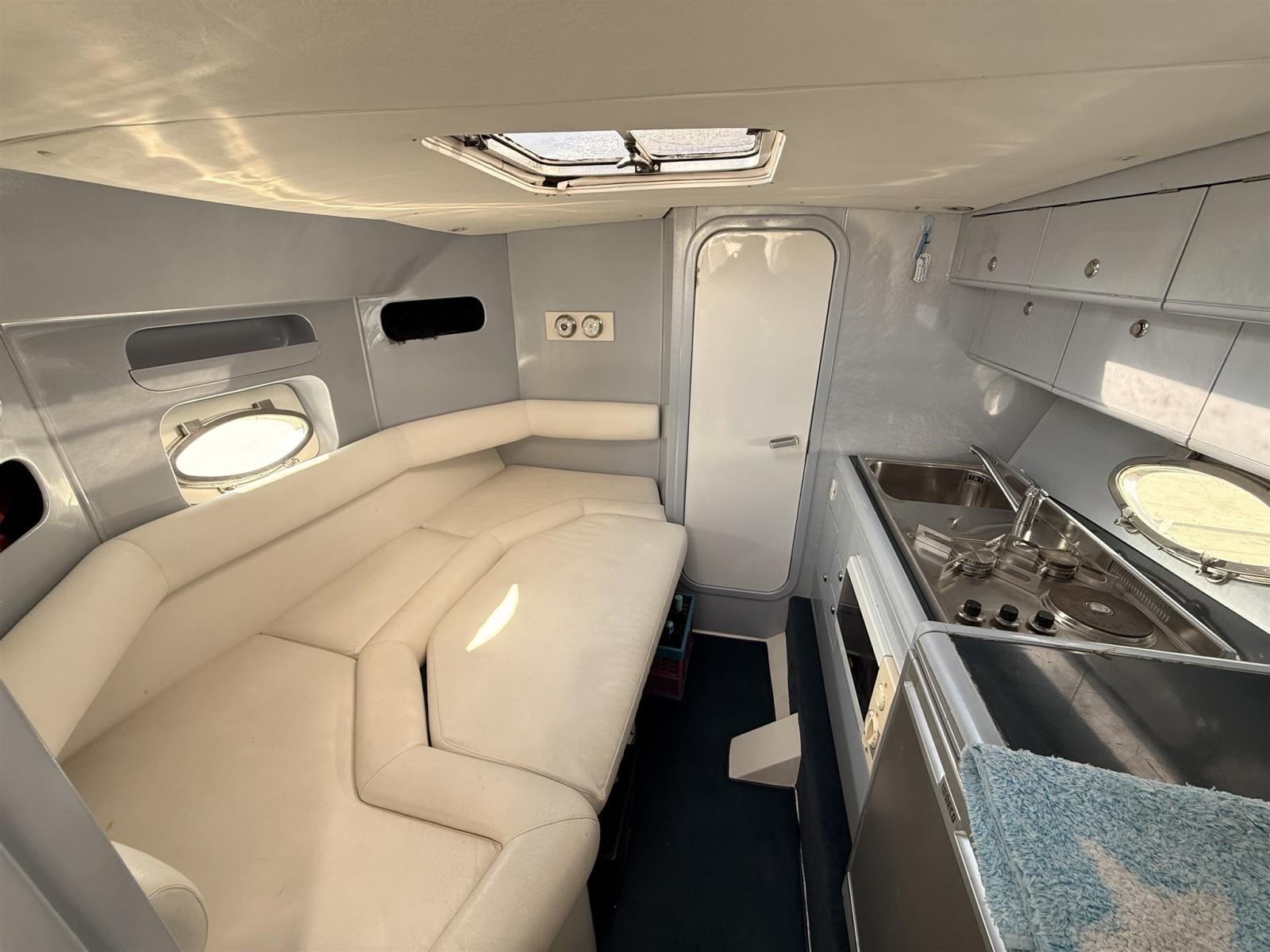 Le bateau se compose d’un vaste espace cockpit, avec un grand pont soleil arrière et un coin canapé ainsi qu’un siège pilote et copilote