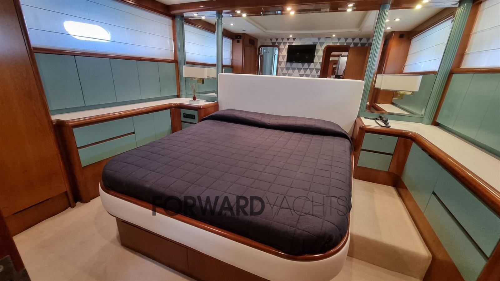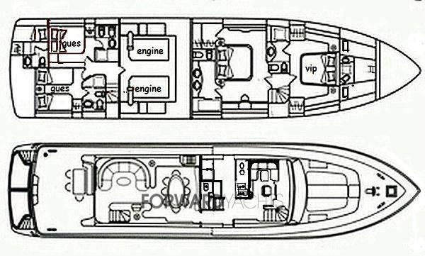 Aménagement intérieur composé de 4 cabines avec services connexes. Demi-salle de bain. Zone équipage avec deux cabines pour trois personnes.