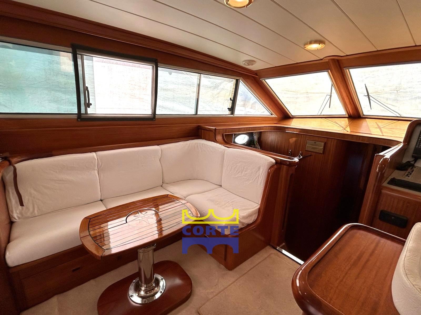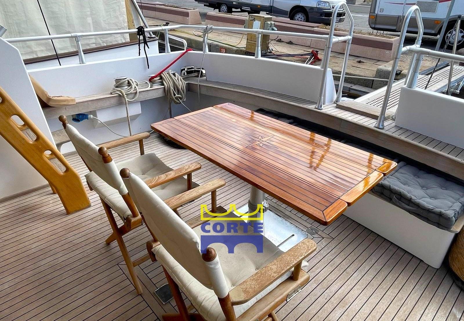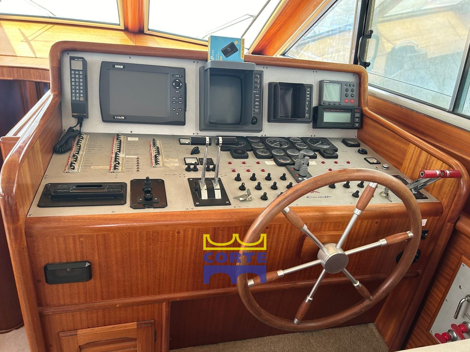 Alarme moteur, Alarme de pompe de cale, Eau sous pression, Système de vidange, Passavant en teck, Douche de cockpit, Double barre à roue, Phare de poursuite, Flaps hydrauliques, Bossoirs pour annexe (passerella idraulica), Extincteur(s) fixe(s), Passerelle (elettroidraulica), Plateforme arrière (poppa in teak), Pompe de cale automatique, Porte latérale, Cockpit en teck, Prise de quai, Connexion eau sous pression à quai, Guindeau électrique, table de cockpit (regolabile in altezza e movibile verso prua), Annexe, Corne, 2 Winch électrique arrière, Winch électrique avant.
